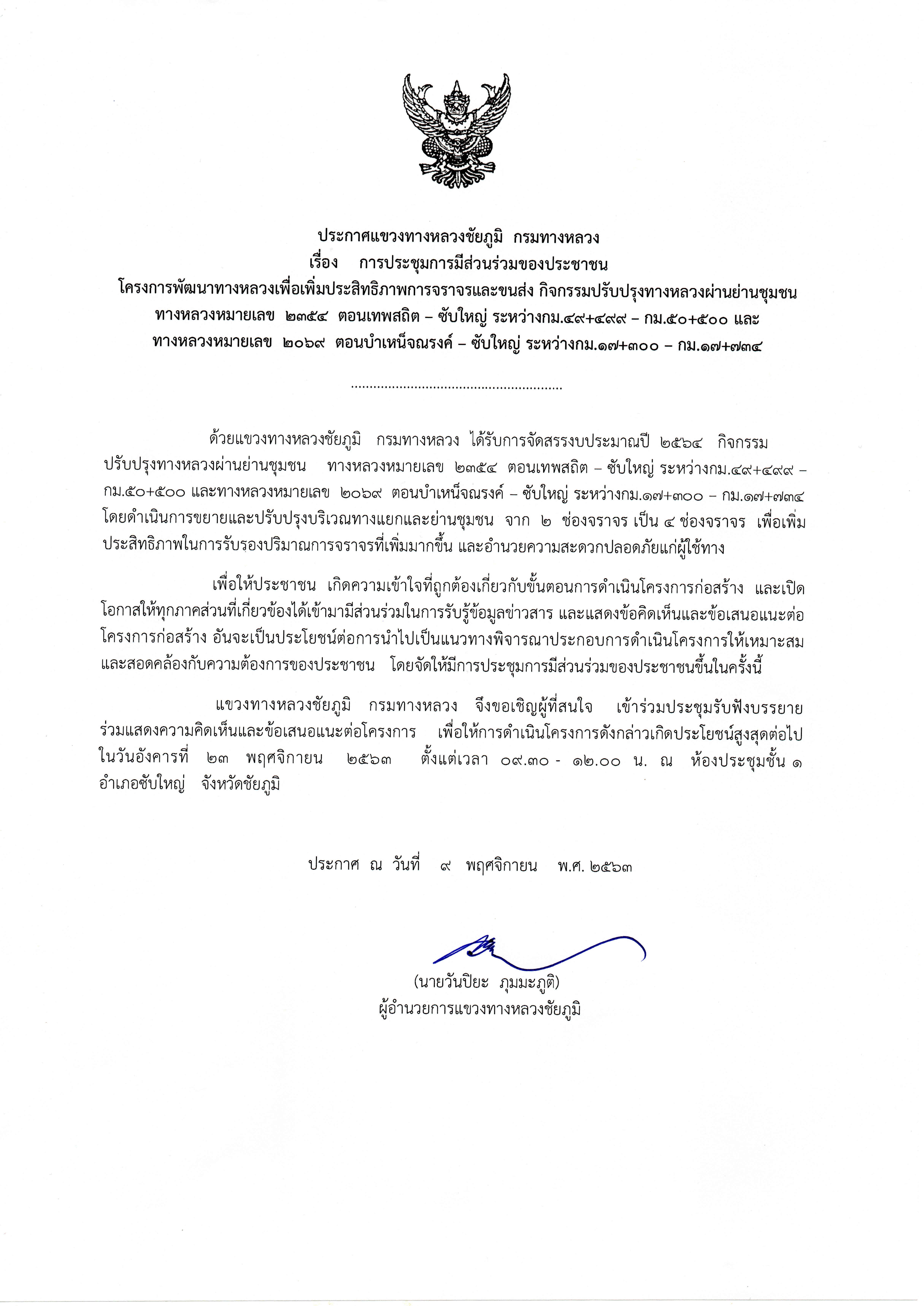 แขวงทางหลวงชัยภูมิจัดประชุมการมีส่วนร่วมของประชาชน โครงการพัฒนาทางหลวงเพื่อเพิ่มประสิทธิภาพการจราจรและขนส่ง