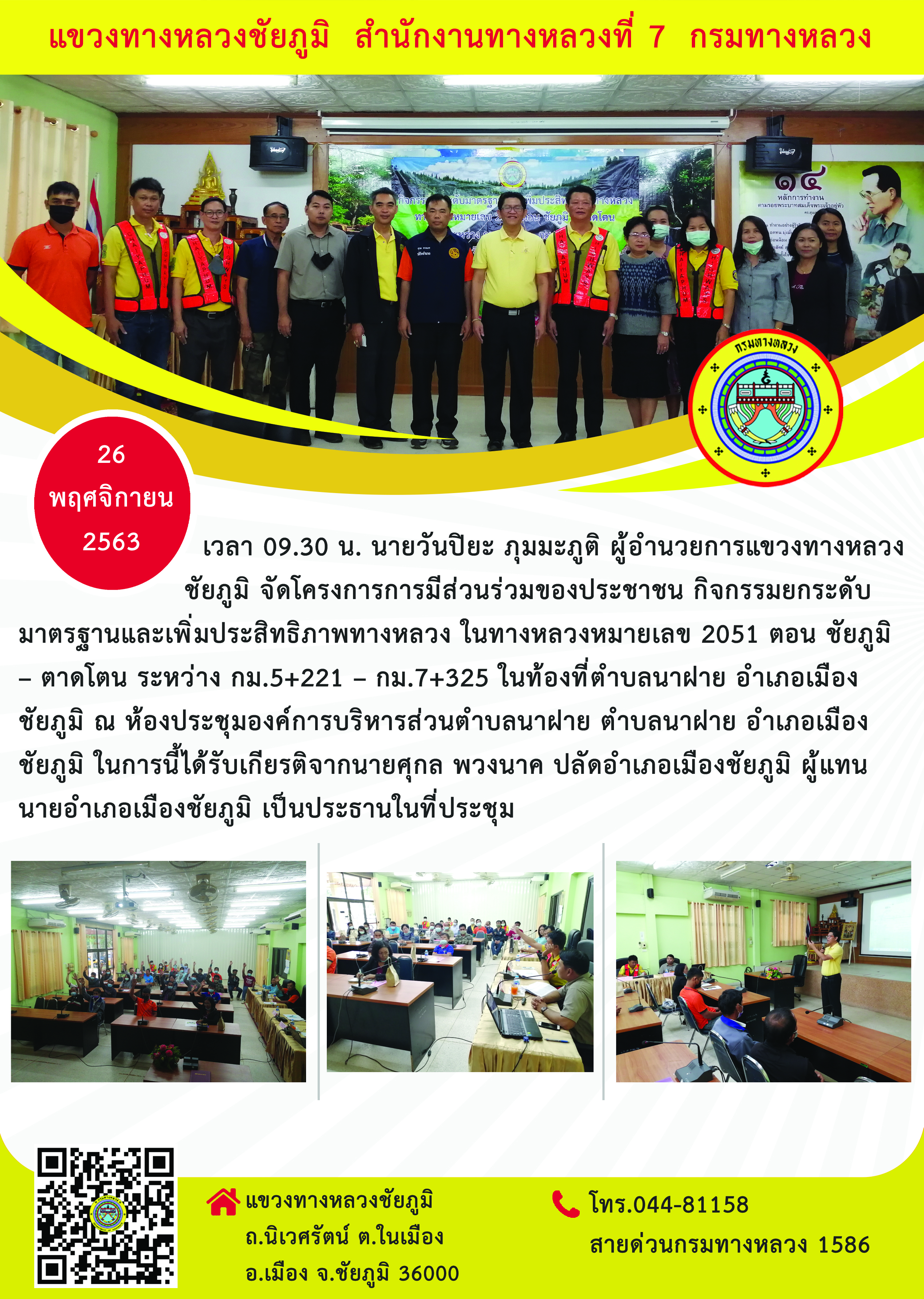 วันที่ 26 พฤศจิกายน 25636 เวลา 09.30 น. นายวันปิยะ ภุมมะภูติ ผู้อำนวยการแขวงทางหลวงชัยภูมิ จัดโครงการการมีส่วนร่วมของประชาชน กิจกรรมยกระดับมาตรฐานและเพิ่มประสิทธิภาพทางหลวง ในทางหลวงหมายเลข 2051 ตอน ชัยภูมิ – ตาดโตน ระหว่าง กม.5+221 – กม.7+325 ในท้องที่ตำบลนาฝาย อําเภอเมืองชัยภูมิ ณ ห้องประชุมองค์การบริหารส่วนตำบลนาฝาย ตำบลนาฝาย อําเภอเมืองชัยภูมิ ในการนี้ได้รับเกียรติจากนายศุกล พวงนาค ปลัดอำเภอเมืองชัยภูมิ ผู้แทนนายอำเภอเมืองชัยภูมิ เป็นประธานในที่ประชุม