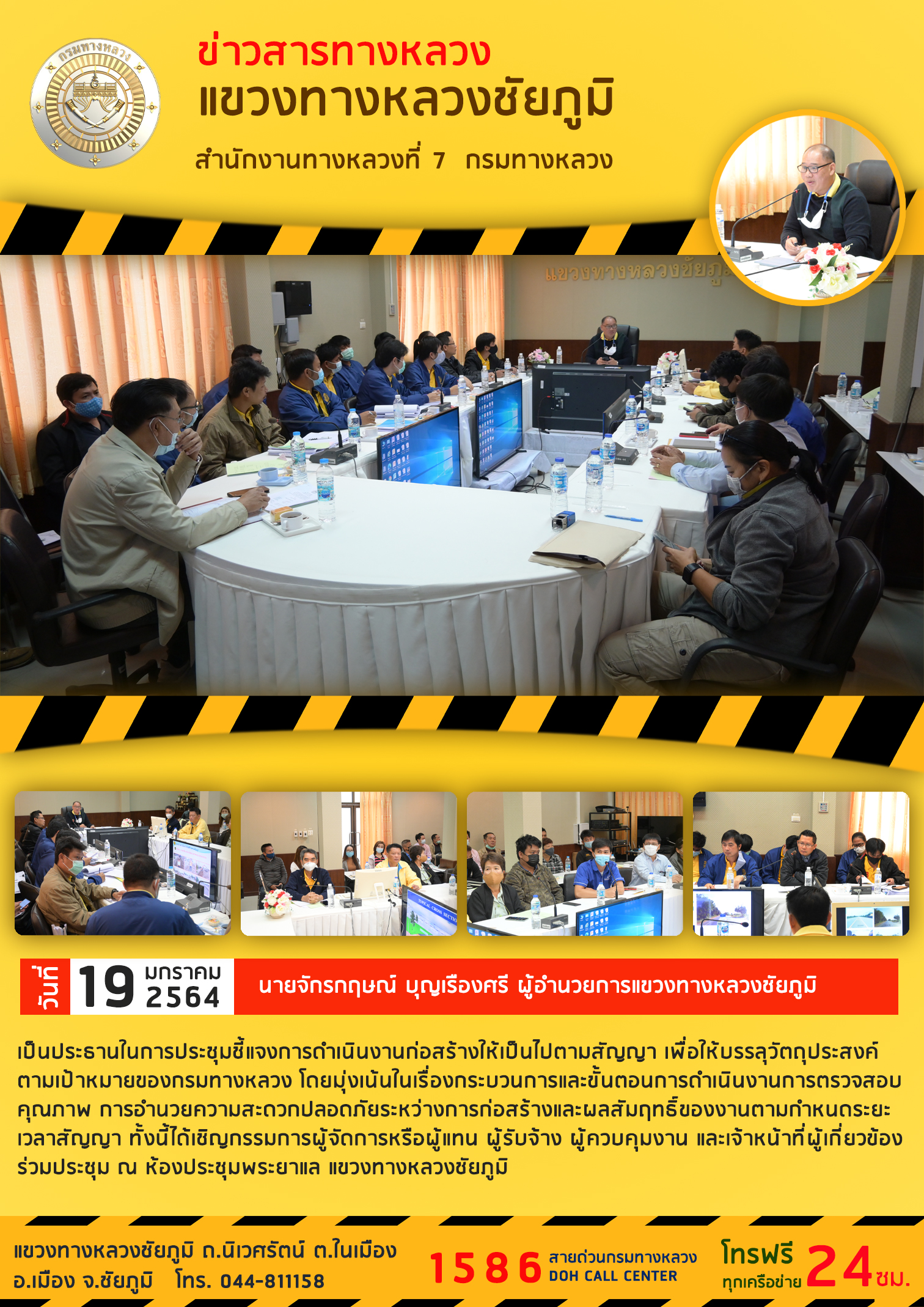 วันที่ 19 มกราคม 2564 นายจักรกฤษณ์ บุญเรืองศรี ผู้อำนวยการแขวงทางหลวงชัยภูมิ เป็นประธานในการประชุมชี้แจงการดำเนินงานก่อสร้างให้เป็นไปตามสัญญา เพื่อให้บรรลุวัตถุประสงค์ตามเป้าหมายของกรมทางหลวง โดยมุ่งเน้นในเรื่องกระบวนการและขั้นตอนการดำเนินงานการตรวจสอบคุณภาพ การอำนวยความสะดวกปลอดภัยระหว่างการก่อสร้างและผลสัมฤทธิ์ของงานตามกำหนดระยะเวลาสัญญา ทั้งนี้ได้เชิญกรรมการผู้จัดการหรือผู้แทน ผู้รับจ้าง ผู้ควบคุมงาน และเจ้าหน้าที่ผู้เกี่ยวข้อง ร่วมประชุม ณ ห้องประชุมพระยาแล แขวงทางหลวงชัยภูมิ