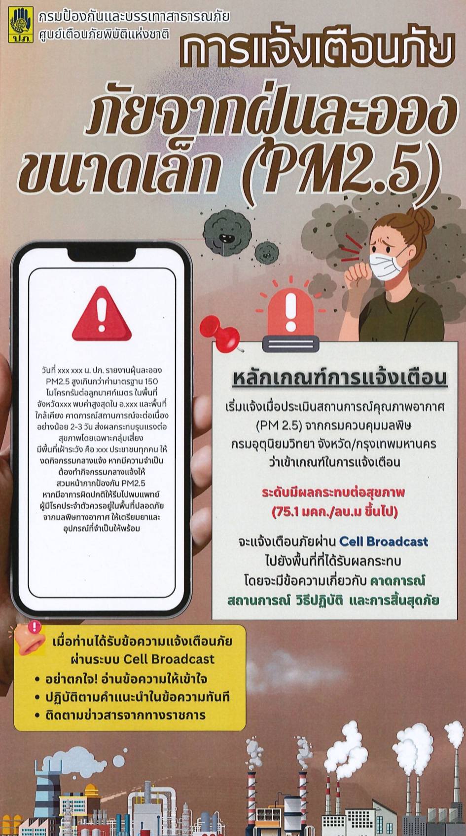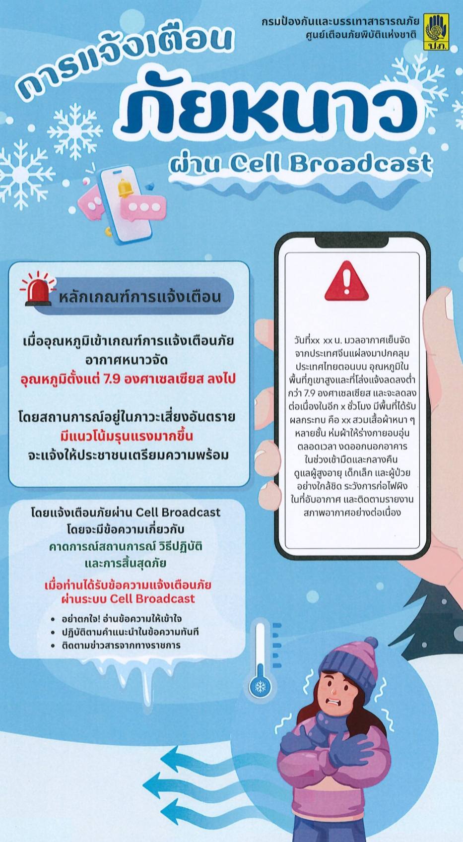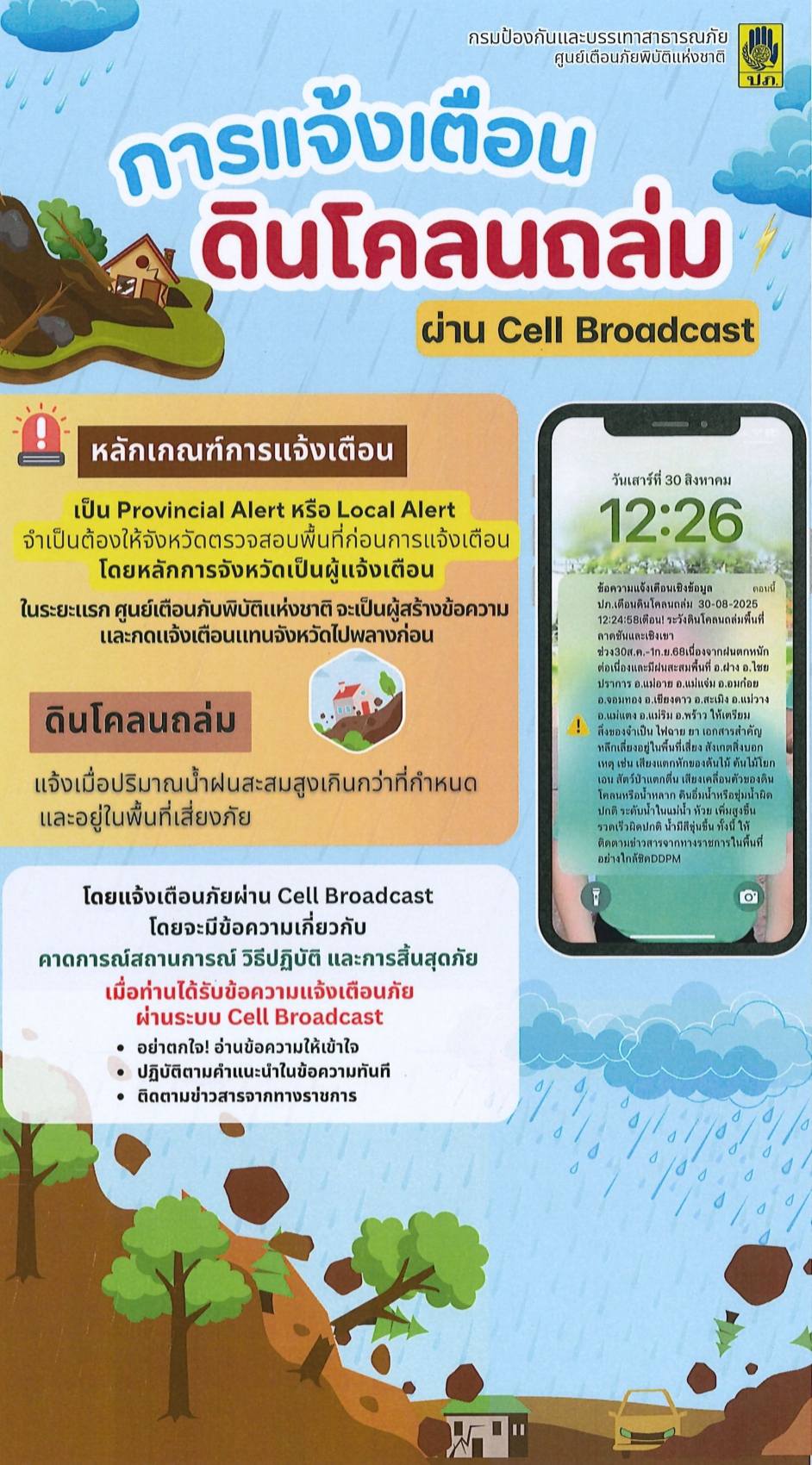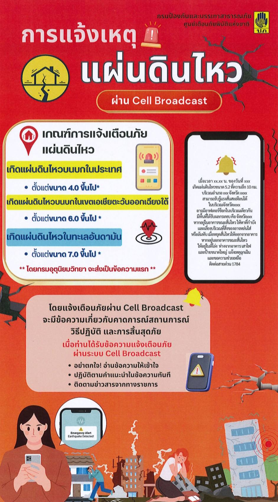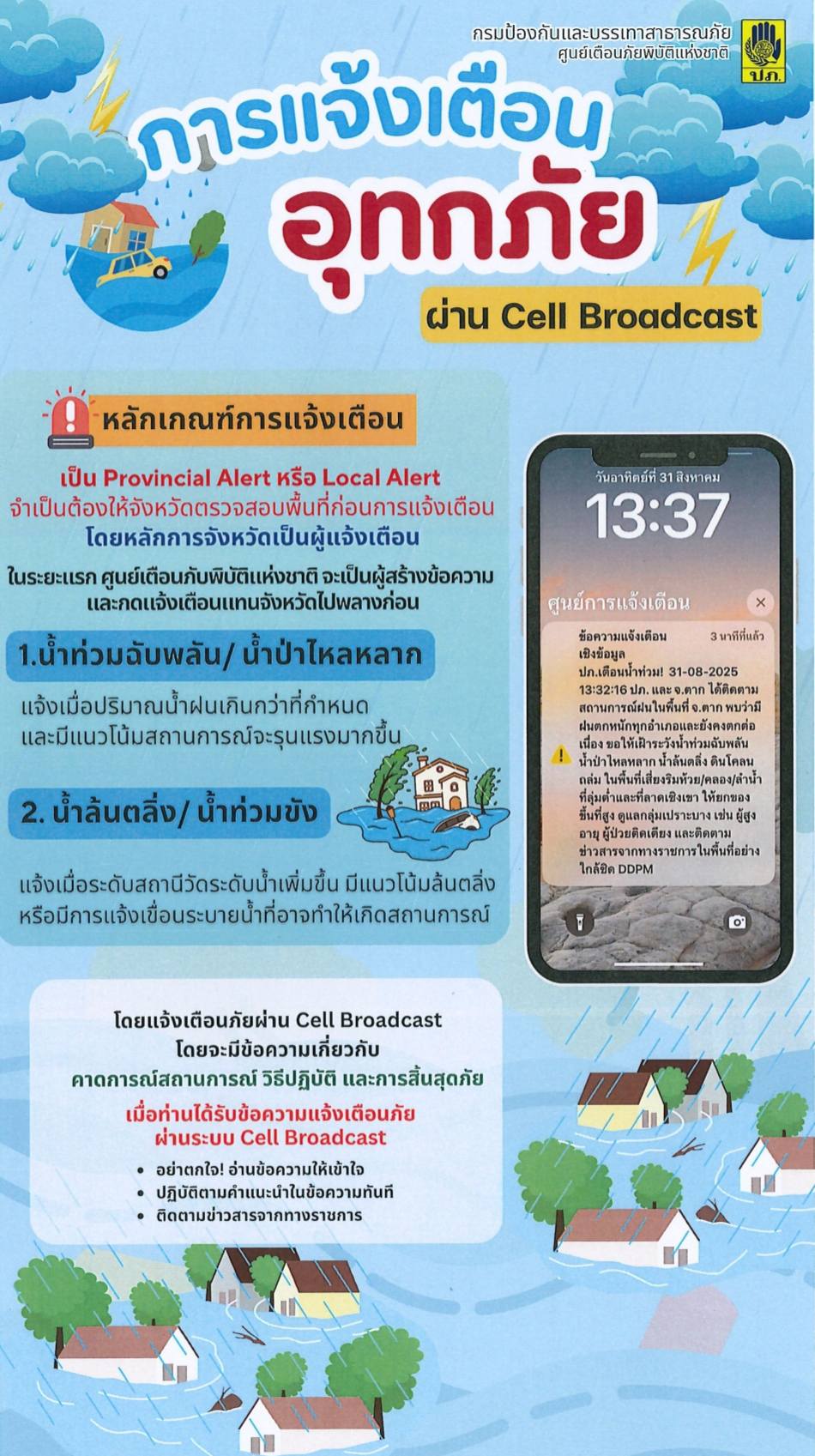 ทั้งนี้ สำหรับข้อความแจ้งเตือนภัยผ่านสัญญาณโทรศัพท์เคลื่อนที่ ( Cell Broadcast ) จะไม่มีการแนบ Link หรือ File ใด ๆ ทั้งสิ้น