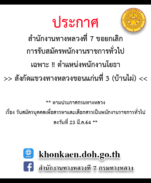 ขอยกเลิกการประกาศรับสมัครพนักงานราชการทั่วไป เฉพาะตำแหน่งพนักงานโยธา สังกัดแขวงทางหลวงขอนแก่นที่ 3 (บ้านไผ่)