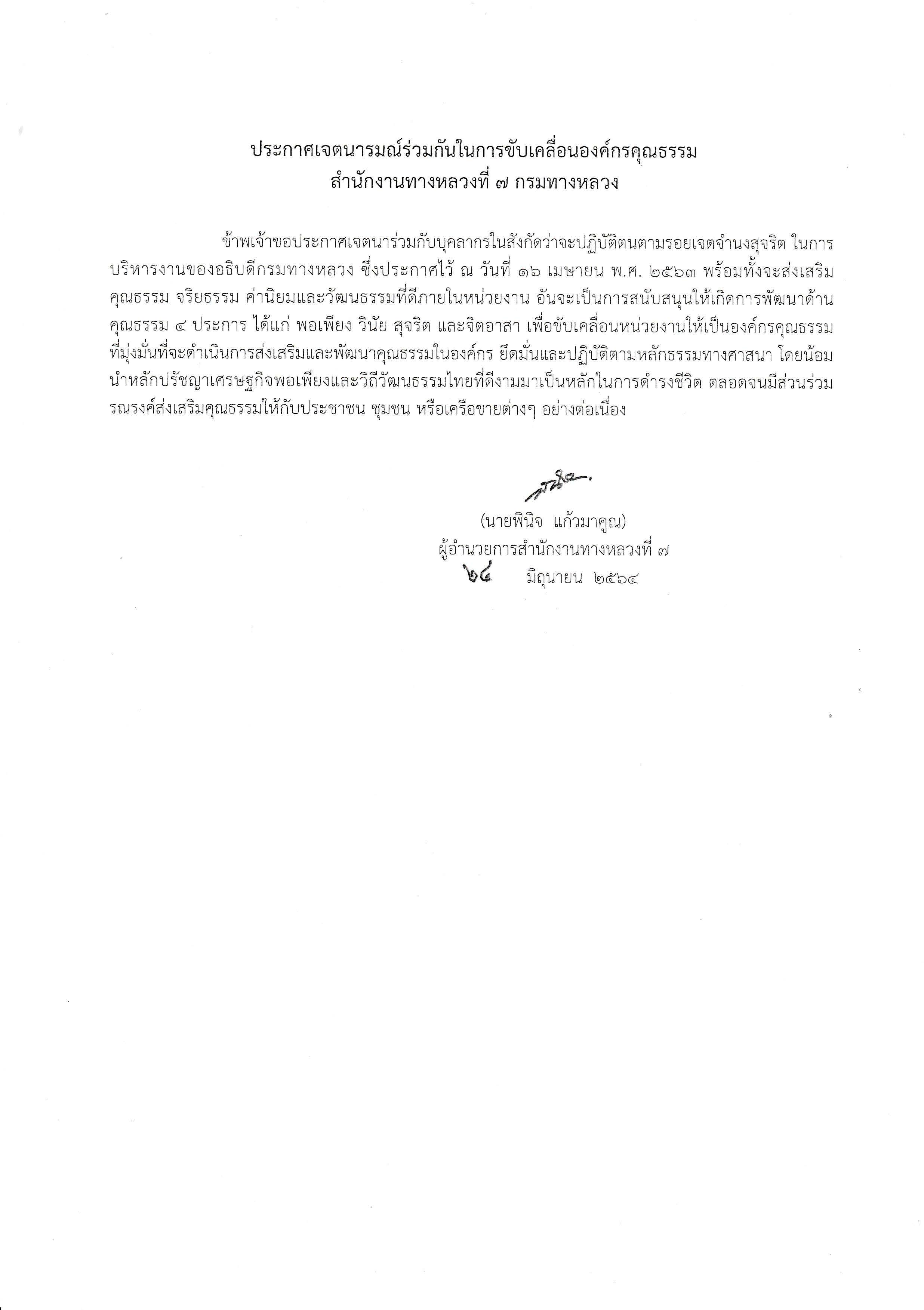 ประกาศเจตนารมณ์ร่วมกันในการขับเคลื่อนองค์กรคุณธรรม สำนักงานทางหลวงที่ 7