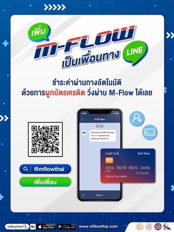 สมัครใช้บริการ M-FLOW ง่าย ๆ เพียง 2 นาที ผ่าน Line OA. เพิ่มเพื่อน @mflowthai หรือ สแกน QR Code แล้วผูกกับบัตรเครดิต