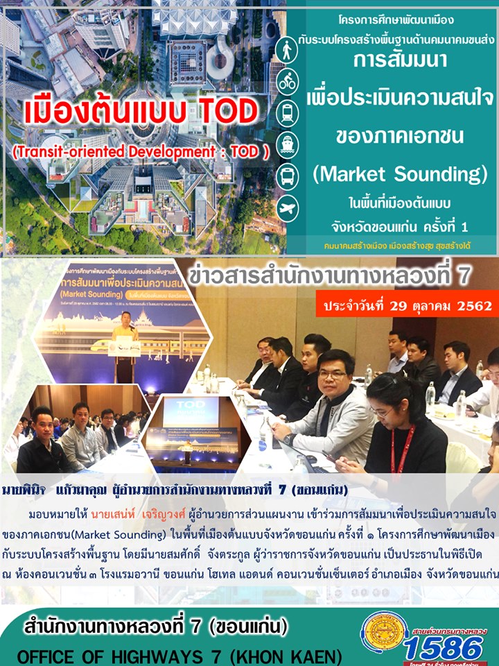 มอบหมายให้ นายเสน่ห์ เจริญวงศ์ ผู้อำนวยการส่วนแผนงาน เข้าร่วมการสัมมนาเพื่อประเมินความสนใจของภาคเอกชน(Market Sounding) ในพื้นที่เมืองต้นแบบจังหวัดขอนแก่น ครั้งที่ 1 โครงการศึกษาพัฒนาเมืองกับระบบโครงสร้างพื้นฐาน ซึ่งโครงการนี้ เป็นโครงการของสำนักนโยบายและแผนการขนส่งและจราจร (สนข.) โดยมีเป้าหมายในการพัฒนาเมืองโดยรอบแนวโครงข่ายเส้นทางรอบสถานีขนส่งมวลชน (Transit-oriented Development : TOD) เพื่อเป็นกรอบชี้นำการพัฒนาเมืองควบคู่กับการพัฒนาระบบคมนาคมขนส่ง ช่วยสร้างมูลค่าเพิ่มให้กับระบบคมนาคมขนส่งและเพิ่มขีดความสามารถในการแข่งขันของประเทศ โดยมีระยะเวลาดำเนินโครงการ 18 เดือน ซึ่งปัจจุบันการศึกษาอยู่ในขั้นตอนของการจัดสัมมนาเพื่อประเมินความสนใจภาคเอกชน (Market Sounding) ในพื้นที่เมืองต้นแบบ