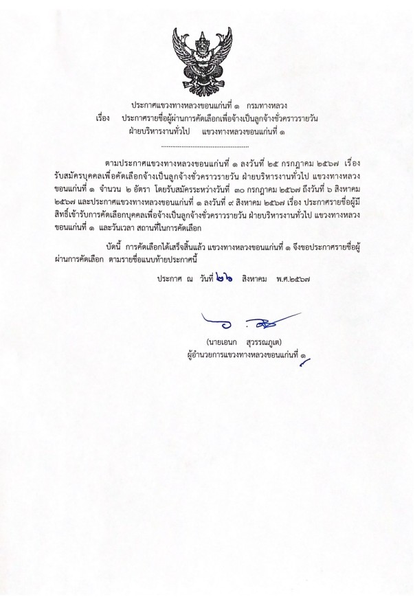 เรื่อง ประกาศรายชื่อผู้ผ่านการคัดเลือกเพื่อจ้างเป็นลูกจ้างชั่วคราวรายวัน ฝ่ายบริหารงานทั่วไป ตามประกาศแขวงทางหลวงขอนแก่นที่ 1 กรมทางหลวง ลงวันที่ 9 สิงหาคม 2567