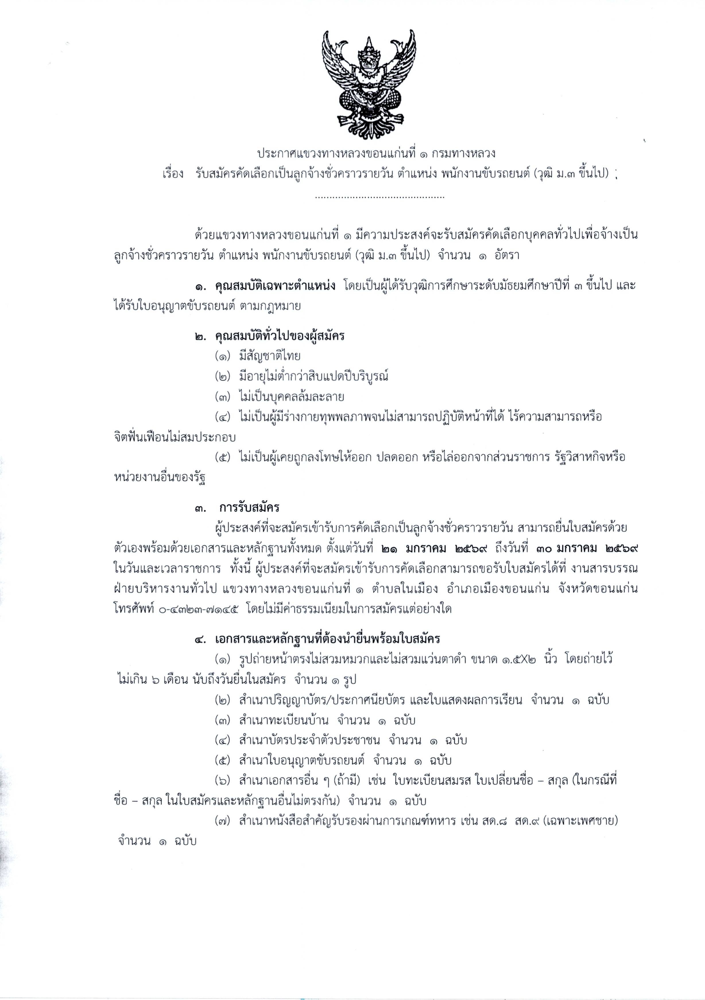 แขวงทางหลวงขอนแก่นที่ 1 รับสมัครลูกจ้างชั่วคราวรายวัน ตำแหน่งพนักงานขับรถยนต์ จำนวน 1 อัตรา