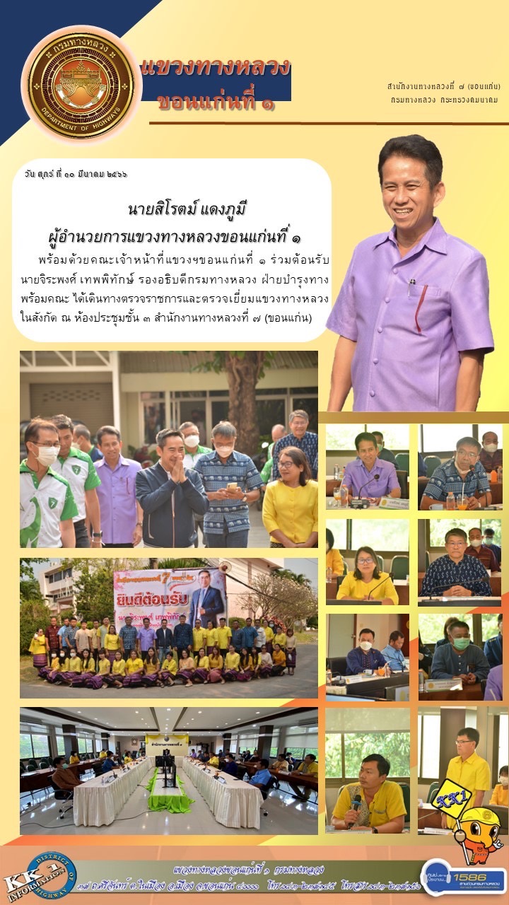 วันศุกร์ ที่ 10 มีนาคม 2566 นายสิโรตม์ แดงภูมี ผู้อำนวยการแขวงทางหลวงขอนแก่นที่ 1 พร้อมด้วยคณะเจ้าหน้าที่แขวงฯขอนแก่นที่ 1 ร่วมต้อนรับ