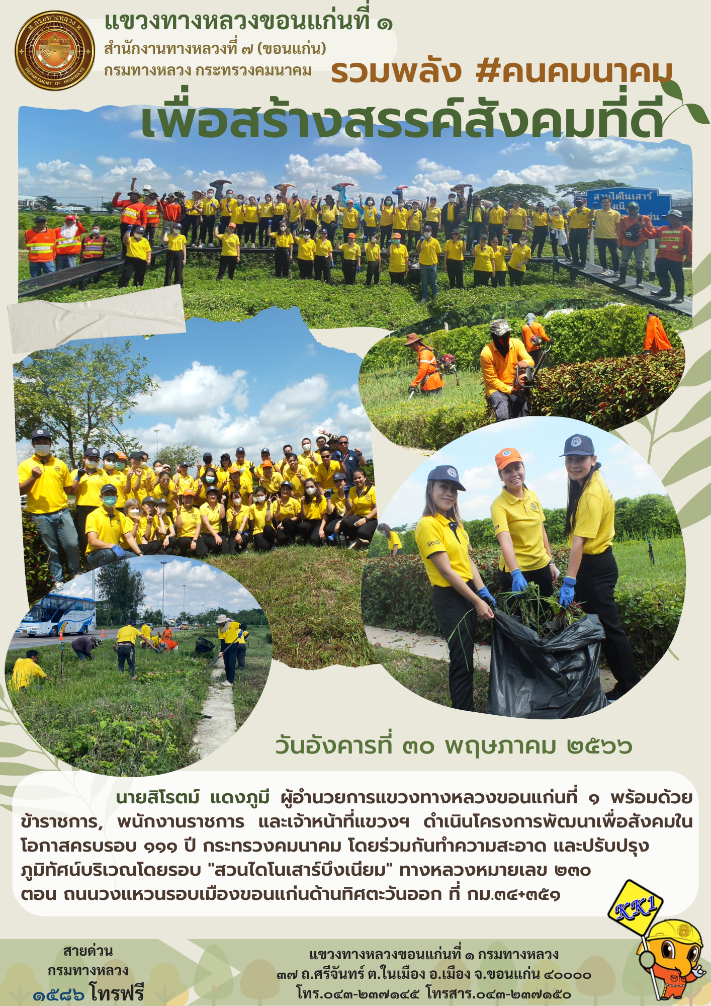 นายสิโรตม์ แดงภูมี ผู้อำนวยการแขวงทางหลวงขอนแก่นที่ 1 พร้อมด้วยข้าราชการ, พนักงานราชการ และเจ้าหน้าที่แขวงฯ ดำเนินโครงการพัฒนาเพื่อสังคมในโอกาสครบรอบ 111 ปี กระทรวงคมนาคม โดยร่วมกันทำความสะอาด และปรับปรุงภูมิทัศน์บริเวณโดยรอบ "สวนไดโนเสาร์บึงเนียม" ทางหลวงหมายเลข 230 ตอน ถนนวงแหวนรอบเมืองขอนแก่นด้านทิศตะวันออก ที่ กม.34+351