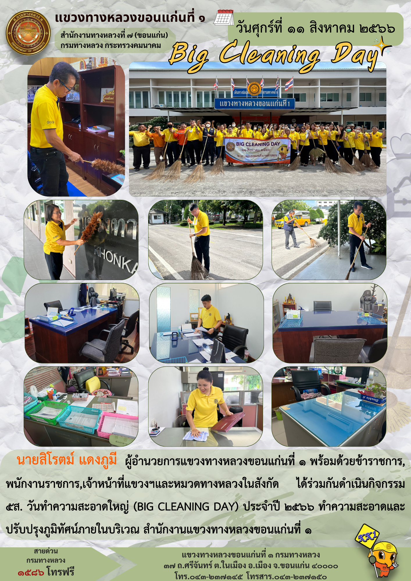 นายสิโรตม์ แดงภูมี ผู้อำนวยการแขวงทางหลวงขอนแก่นที่ 1 พร้อมด้วยข้าราชการ, พนักงานราชการ,เจ้าหน้าที่แขวงฯและหมวดทางหลวงในสังกัด ได้ร่วมกันดำเนินกิจกรรม 5ส. วันทำความสะอาดใหญ่ (BIG CLEANING DAY) ประจำปี 2566 ทำความสะอาดและปรับปรุงภูมิทัศน์ภายในบริเวณ สำนักงานแขวงทางหลวงขอนแก่นที่ 1