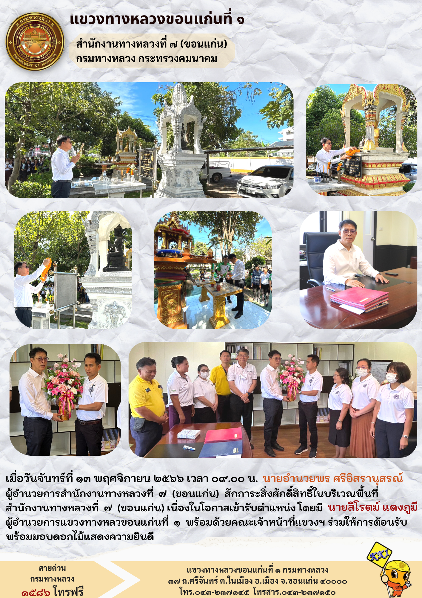 เมื่อวันจันทร์ที่ 13 พฤศจิกายน 2566 เวลา 09.00 น. นายอำนวยพร ศรีอิสรานุสรณ์ ผู้อำนวยการสำนักงานทางหลวงที่ 7 (ขอนแก่น) สักการะสิ่งศักดิ์สิทธิ์ในบริเวณพื้นที่ สำนักงานทางหลวงที่ 7 (ขอนแก่น) เนื่องในโอกาสเข้ารับตำแหน่ง โดยมี นายสิโรตม์ แดงภูมี ผู้อำนวยการแขวงทางหลวขอนแก่นที่ 1 พร้อมด้วยคณะเจ้าหน้าที่แขวงฯ ร่วมให้การต้อนรับพร้อมมอบดอกไม้แสดงความยินดี