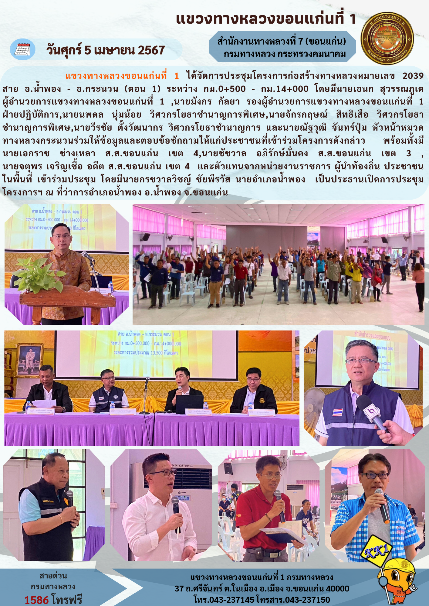 แขวงทางหลวงขอนแก่นที่ 1 ได้จัดการประชุมโครงการก่อสร้างทางหลวงหมายเลข 2039 สาย อ.น้ำพอง - อ.กระนวน (ตอน 1) ระหว่าง กม.0+500 - กม.14+000 โดยมีนายเอนก สุวรรณภูเต ผู้อำนวยการแขวงทางหลวงขอนแก่นที่ 1 ,นายมังกร กัลยา รองผู้อำนวยการแขวงทางหลวงขอนแก่นที่ 1 ฝ่ายปฏิบัติการ,นายนพดล นุ่มน้อย วิศวกรโยธาชำนาญการพิเศษ,นายจักรกฤษณ์ สิทธิเสือ วิศวกรโยธาชำนาญการพิเศษ,นายวีรชัย ตั้งวัฒนากร วิศวกรโยธาชำนาญการ และนายณัฐวุฒิ จันทร์ปุ่ม หัวหน้าหมวดทางหลวงกระนวนร่วมให้ข้อมูลและตอบข้อซักถามให้แก่ประชาชนที่เข้าร่วมโครงการดังกล่าว พร้อมทั้งมีนายเอกราช ช่างเหลา ส.ส.ขอนแก่น เขต 4,นายชัชวาล อภิรักษ์มั่นคง ส.ส.ขอนแก่น เขต 3 , นายจตุพร เจริญเชื้อ อดีต ส.ส.ขอนแก่น เขต 4 และตัวแทนจากหน่วยงานราชการ ผู้นำท้องถิ่น ประชาชน ในพื้นที่ เข้าร่วมประชุม โดยมีนายกรชวาลวิชญ์ ชัยพีรวัส นายอำเภอน้ำพอง เป็นประธานเปิดการประชุม โครงการฯ ณ ที่ว่าการอำเภอน้ำพอง อ.น้ำพอง จ.ขอนแก่น