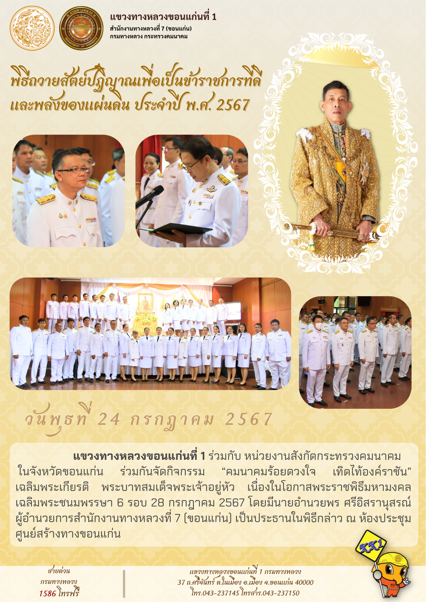 แขวงทางหลวงขอนแก่นที่ 1 ร่วมกับ หน่วยงานสังกัดกระทรวงคมนาคมในจังหวัดขอนแก่น ร่วมกันจัดกิจกรรม “คมนาคมร้อยดวงใจ เทิดไท้องค์ราชัน” เฉลิมพระเกียรติ พระบาทสมเด็จพระเจ้าอยู่หัว เนื่องในโอกาสพระราชพิธีมหามงคลเฉลิมพระชนมพรรษา 6 รอบ 28 กรกฎาคม 2567 โดยมีนายอำนวยพร ศรีอิสรานุสรณ์ ผู้อำนวยการสำนักงานทางหลวงที่ 7 (ขอนแก่น) เป็นประธานในพิธีกล่าว ณ ห้องประชุมศูนย์สร้างทางขอนแก่น