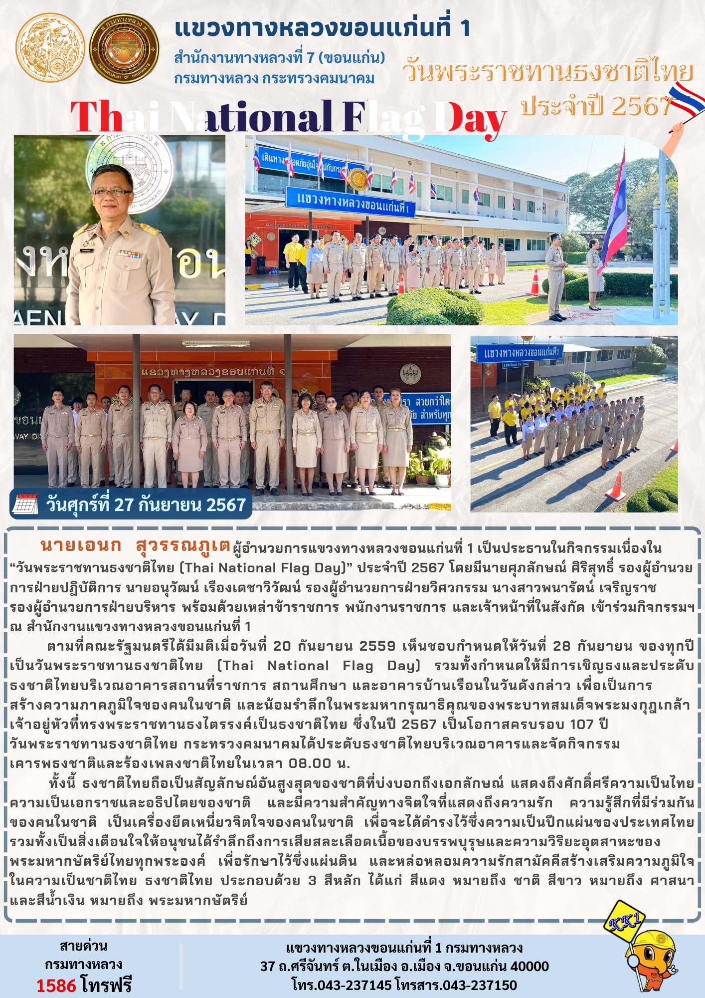 วันศุกร์ที่ 27 กันยายน 2567 นายเอนก สุวรรณภูเต ผู้อำนวยการแขวงทางหลวงขอนแก่นที่ 1 เป็นประธานในกิจกรรมเนื่องใน “วันพระราชทานธงชาติไทย (Thai National Flag Day)” ประจำปี 2567 โดยมีนายอนุวัฒน์ เรืองเดชาวิวัฒน์ รองผู้อำนวยการฝ่ายวิศวกรรม นายศุภลักษณ์ ศิริสุทธิ์ รองผู้อำนวยการฝ่ายปฏิบัติการ นางสาวพนารัตน์ เจริญราช รองผู้อำนวยการฝ่ายบริหาร พร้อมด้วยเหล่าข้าราชการ พนักงานราชการ และเจ้าหน้าที่ในสังกัด เข้าร่วมกิจกรรมฯ ณ สำนักงานแขวงทางหลวงขอนแก่นที่ 1