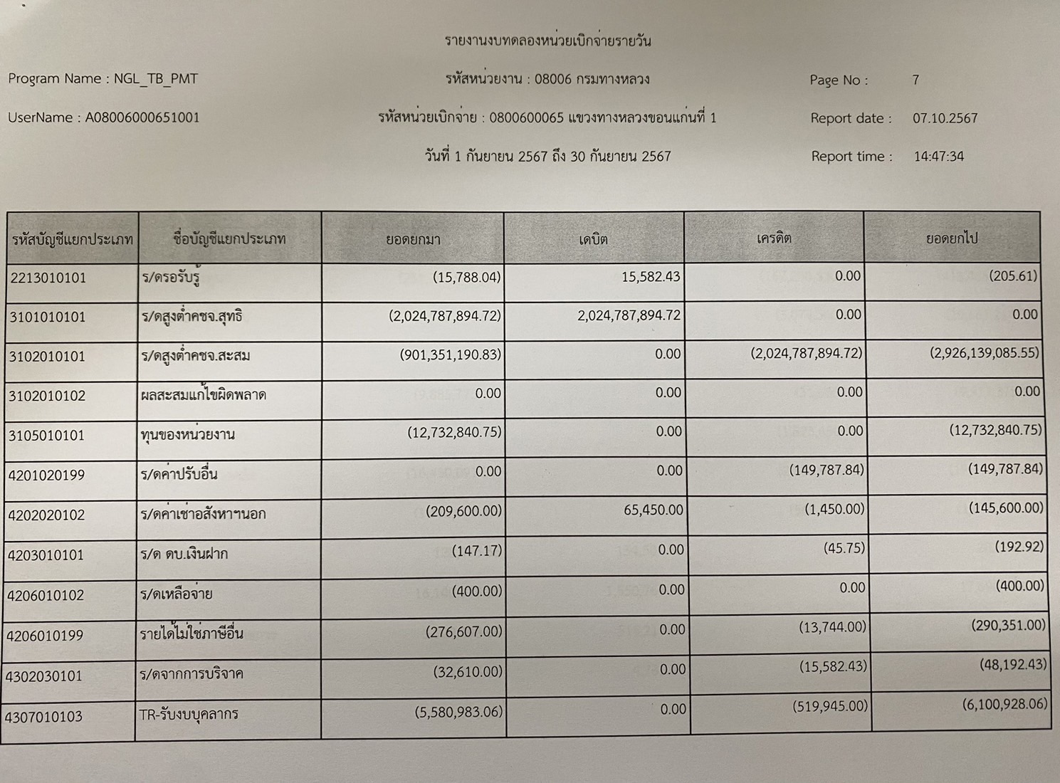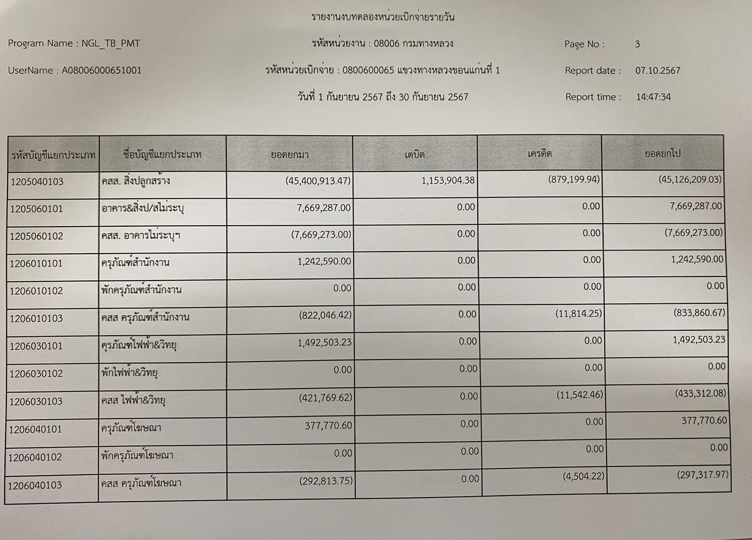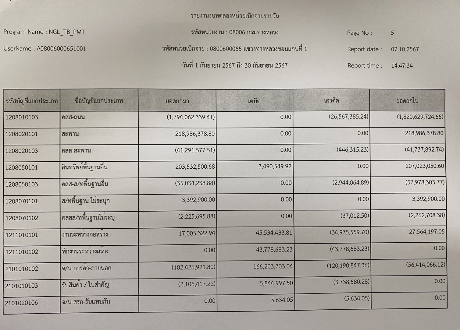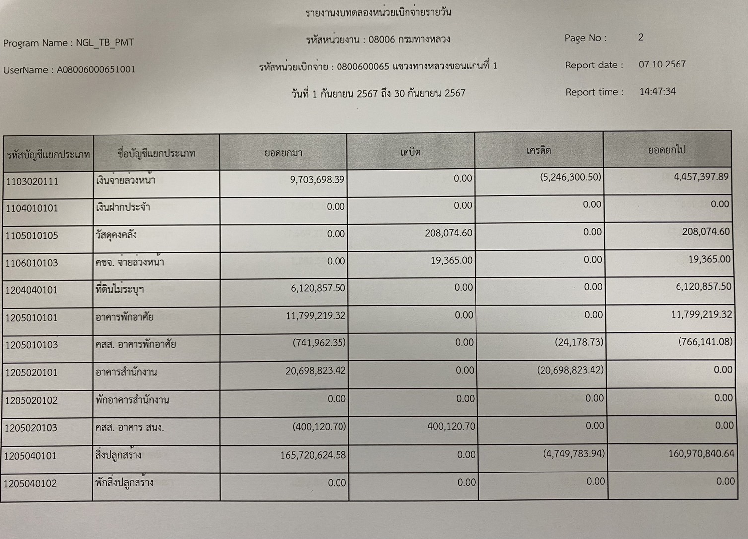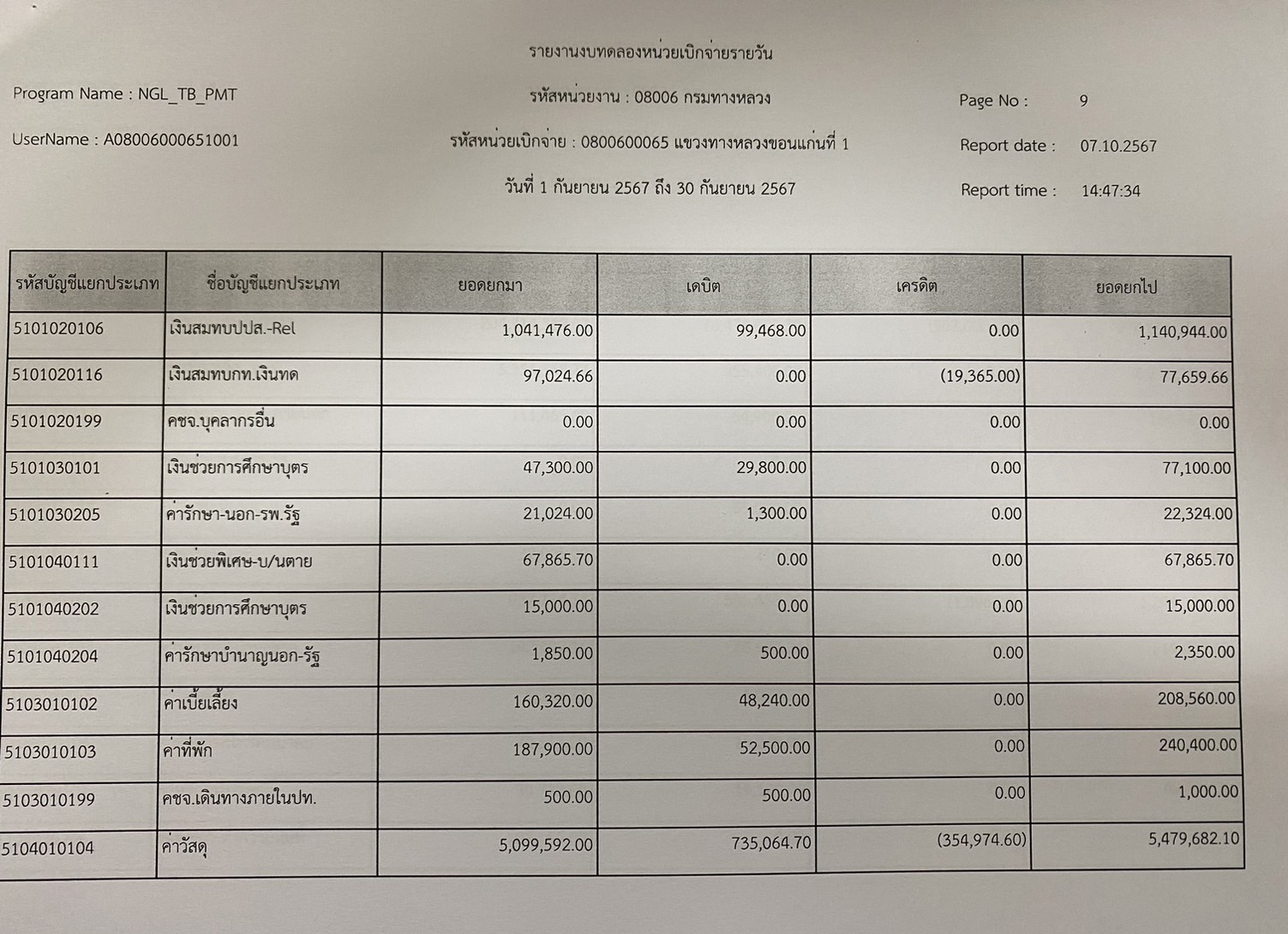 งบทดลองประจำเดือนกันยายน 2567 แขวงทางหลวงขอนแก่นที่ 1 กรมทางหลวง