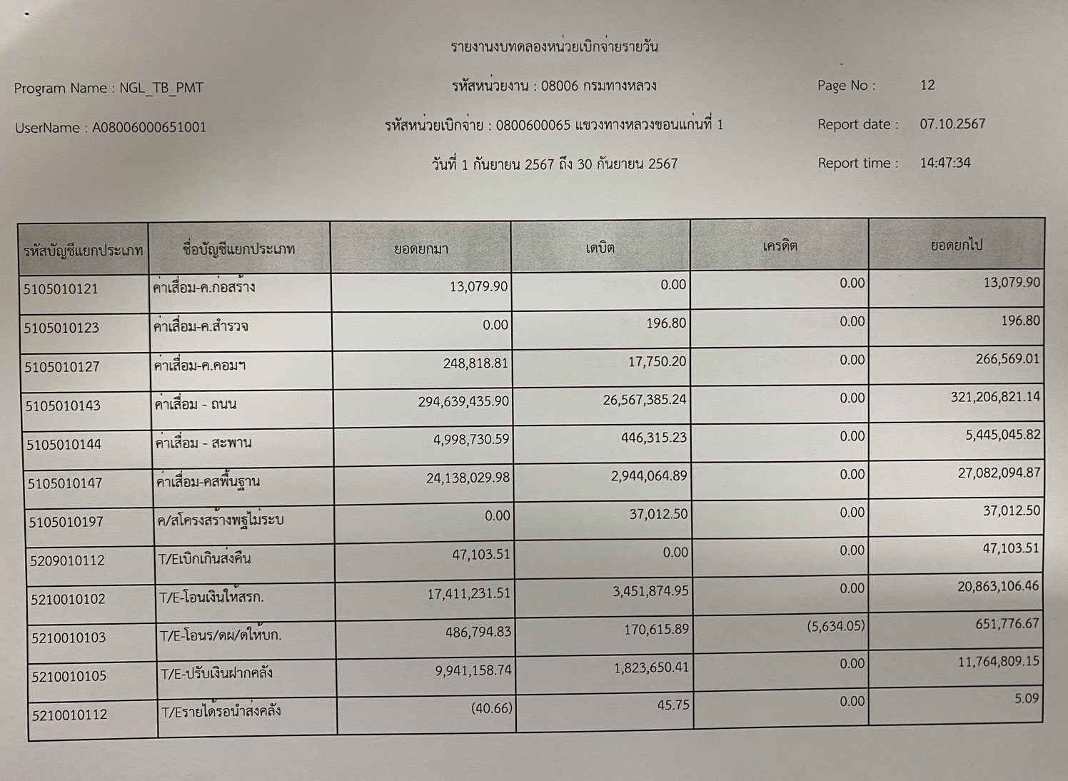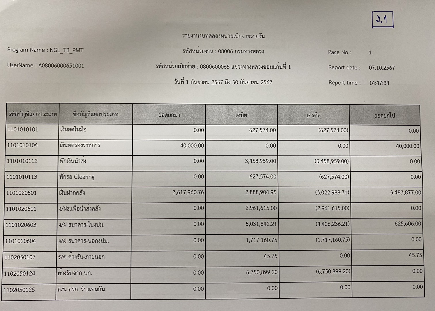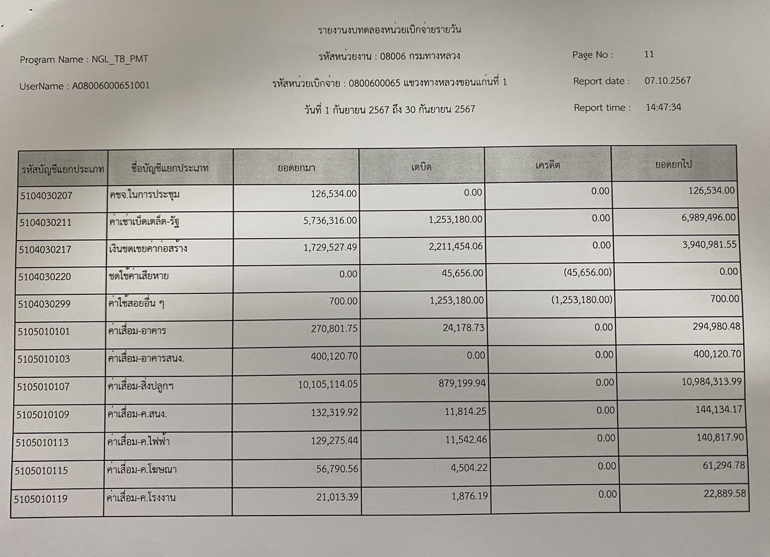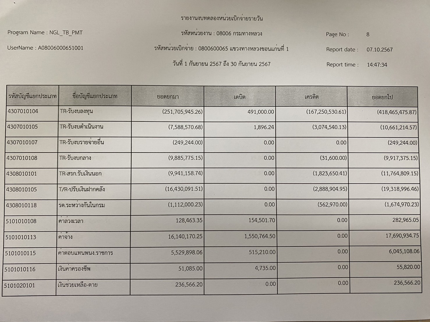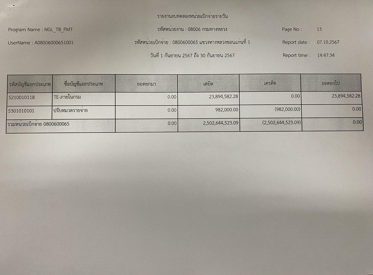 งบทดลองประจำเดือนกันยายน 2567 แขวงทางหลวงขอนแก่นที่ 1 กรมทางหลวง