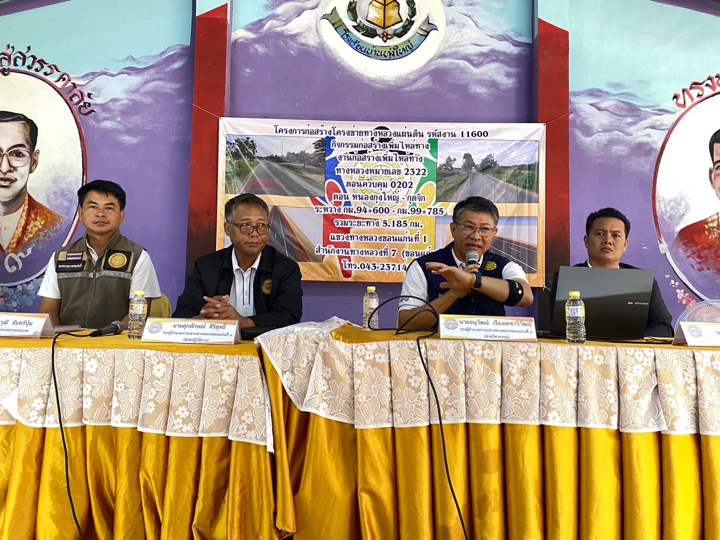 นายเอนก สุวรรณภูเต ผู้อำนวยการแขวงทางหลวงขอนแก่นที่ 1 ได้จัดการประชุมโครงการก่อสร้างโครงข่ายทางหลวงแผ่นดิน กิจกรรมก่อสร้างเพิ่มไหล่ทาง ทางหลวงหมายเลข 2322 ตอนควบคุม 0202 ตอน หนองกุงใหญ่ - กุดจิก ระหว่าง กม.94+600 - กม.99+785 โดยมีนายศราวุธ คีรีวงษ์ วิศวกรโยธาปฏิบัติการ ส่วนสำรวจและออกแบบ สำนักงานทางหลวงที่ 7 (ขอนแก่น), นายศุภลักษณ์ ศิริสุทธิ์ รองผู้อำนวยการแขวงทางหลวงขอนแก่นที่ 1 ฝ่ายปฏิบัติการ, นายอนุวัฒน์ เรืองเดชาวิวัฒน์ รองผู้อำนวยการแขวงทางหลวงขอนแก่นที่ 1 ฝ่ายวิศวกรรม, นางสาวพนารัตน์ เจริญราช รองผู้อำนวยการแขวงทางหลวงขอนแก่นที่ 1 ฝ่ายบริหาร และนายณัฐวุฒิ จันทร์ปุ่ม หัวหน้าหมวดทางหลวงกระนวน ร่วมให้ข้อมูลและตอบข้อซักถามให้แก่ประชาชนที่เข้าร่วมโครงการดังกล่าว โดยมีนายภาวิช บุญภัทดอนชุยแป ปลัดอำเภอกระนวน (เจ้าพนักงานปกครองชำนาญการพิเศษ) เป็นประธานเปิดการประชุมโครงการฯ ณ โรงเรียนบ้านทุ่งใหญ่ อ.กระนวน จ.ขอนแก่น