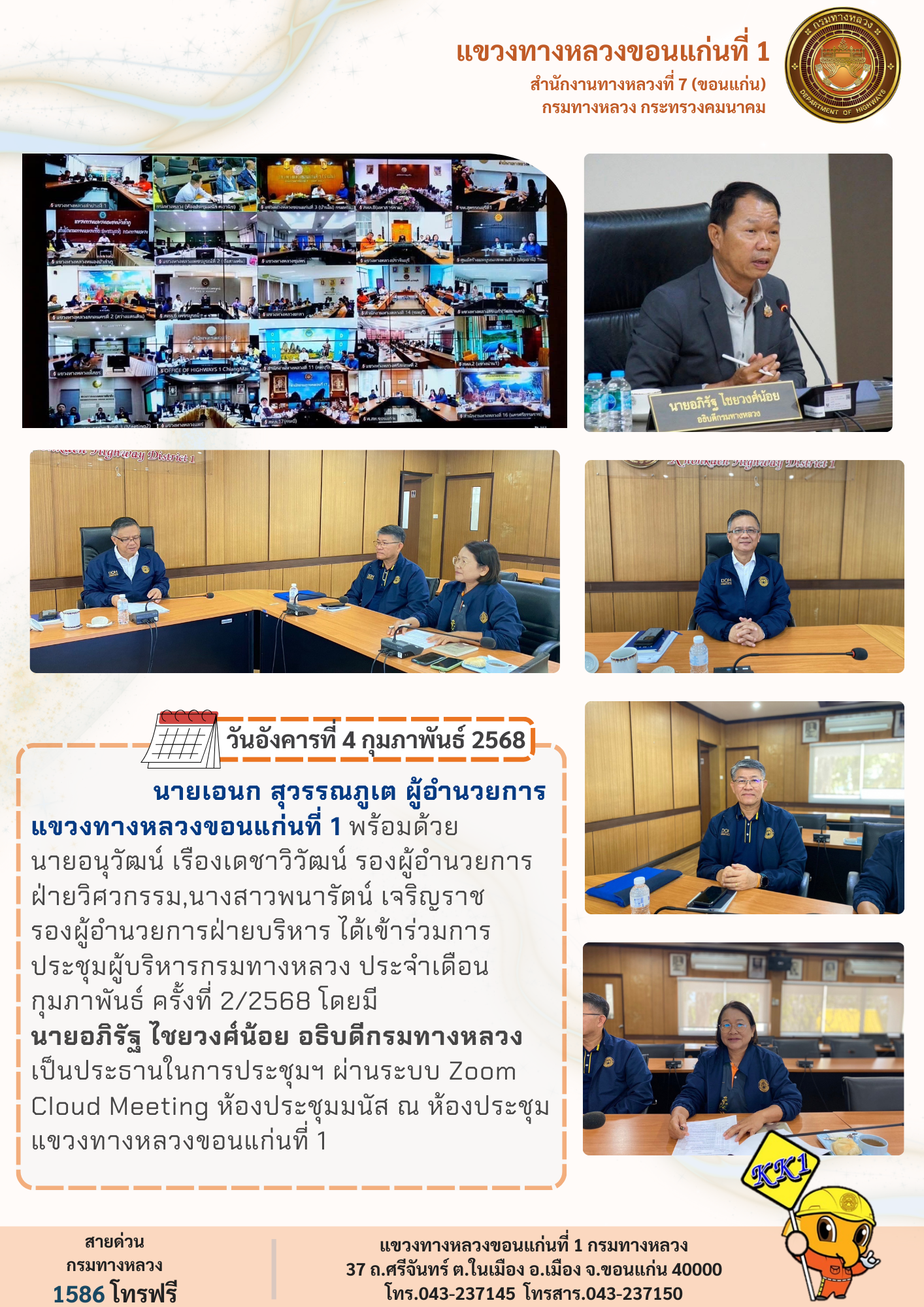 นายเอนก สุวรรณภูเต ผู้อำนวยการแขวงทางหลวงขอนแก่นที่ 1 พร้อมด้วยนายอนุวัฒน์ เรืองเดชาวิวัฒน์ รองผู้อำนวยการฝ่ายวิศวกรรม,นางสาวพนารัตน์ เจริญราช รองผู้อำนวยการฝ่ายบริหาร ได้เข้าร่วมการประชุมผู้บริหารกรมทางหลวง ประจำเดือนกุมภาพันธ์ ครั้งที่ 2/2568 โดยมี นายอภิรัฐ ไชยวงศ์น้อย อธิบดีกรมทางหลวง เป็นประธานในการประชุมฯ ผ่านระบบ Zoom Cloud Meeting ห้องประชุมมนัส ณ ห้องประชุมแขวงทางหลวงขอนแก่นที่ 1