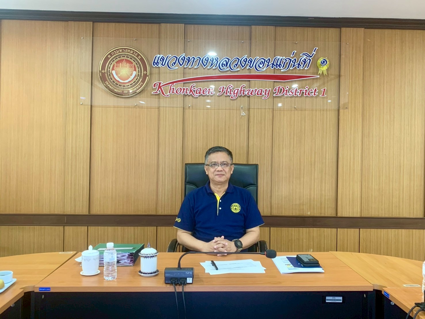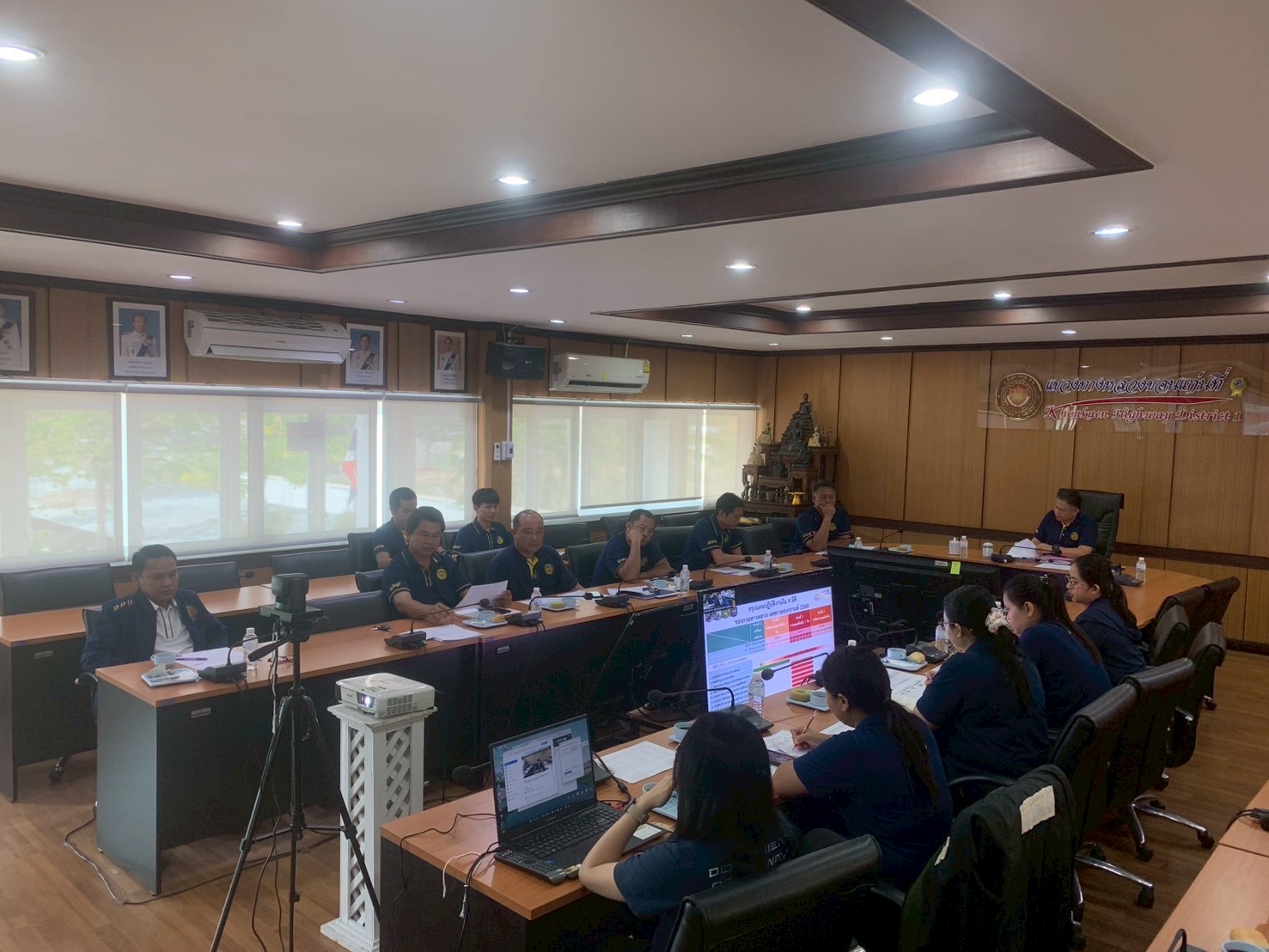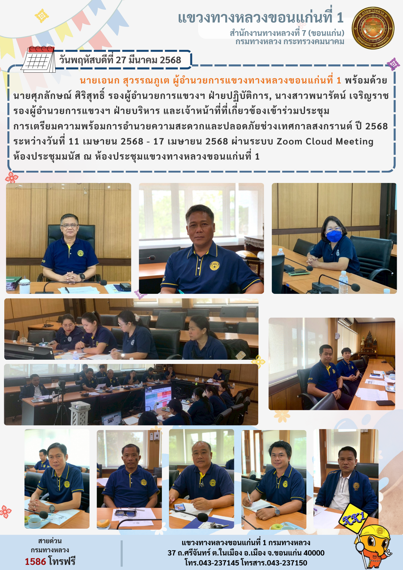 นายเอนก สุวรรณภูเต ผู้อำนวยการแขวงทางหลวงขอนแก่นที่ 1 พร้อมด้วยนายศุภลักษณ์ ศิริสุทธิ์ รองผู้อำนวยการแขวงฯ ฝ่ายปฏิบัติการ, นางสาวพนารัตน์ เจริญราช รองผู้อำนวยการแขวงฯ ฝ่ายบริหาร และเจ้าหน้าที่ที่เกี่ยวข้องเข้าร่วมประชุมการเตรียมความพร้อมด้านการอำนวยความสะดวกและปลอดภัยช่วงเทศกาลสงกรานต์ปี 2568 ระหว่างวันที่ 11 - 17 เมษายน 2568 ผ่านระบบ Zoom Cloud Meeting ห้องประชุมมนัส ณ ห้องประชุมแขวงทางหลวงขอนแก่นที่ 1