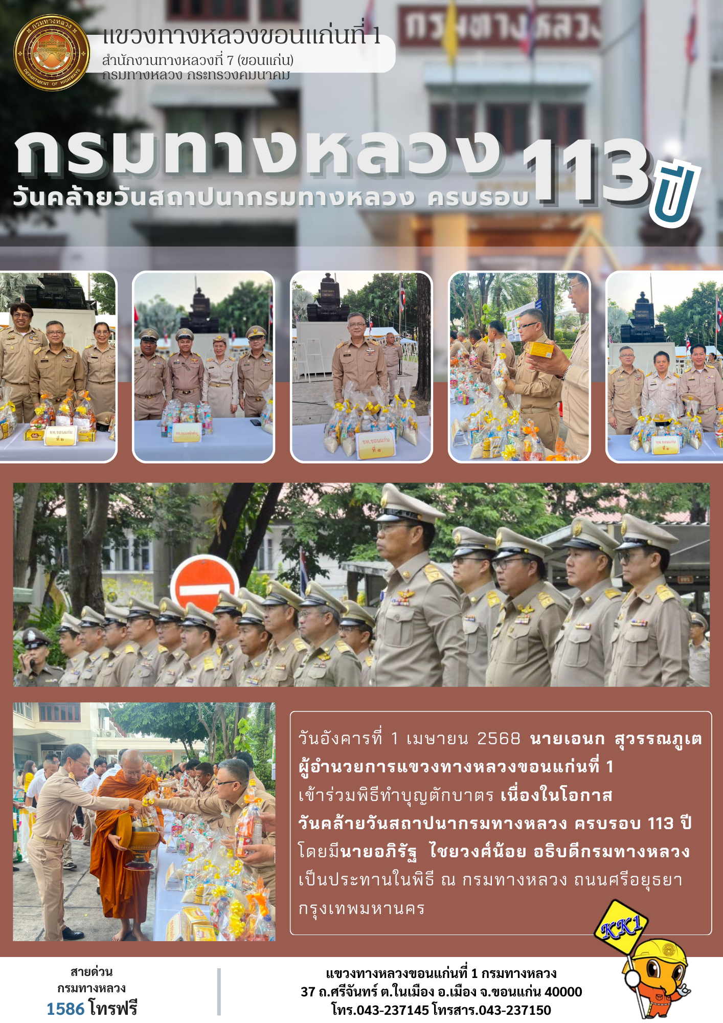 วันอังคารที่ 1 เมษายน 2568 นายเอนก สุวรรณภูเต ผู้อำนวยการแขวงทางหลวงขอนแก่นที่ 1 เข้าร่วมพิธีทำบุญตักบาตร เนื่องในโอกาสวันคล้ายวันสถาปนากรมทางหลวง ครบรอบ 113 ปี โดยมีนายอภิรัฐ ไชยวงศ์น้อย อธิบดีกรมทางหลวง เป็นประทานในพิธี ณ กรมทางหลวง ถนนศรีอยุธยา กรุงเทพมหานคร