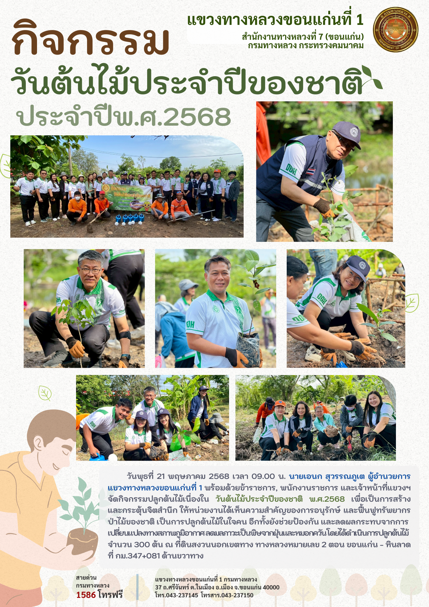 วันพุธที่ 21 พฤษภาคม 2568 เวลา 09.00 น. นายเอนก สุวรรณภูเต ผู้อำนวยการแขวงทางหลวงขอนแก่นที่ 1 พร้อมด้วยข้าราชการ, พนักงานราชการ และเจ้าหน้าที่แขวงฯ จัดกิจกรรมปลูกต้นไม้เนื่องใน วันต้นไม้ประจำปีของชาติ พ.ศ.2568 เพื่อเป็นการสร้าง และกระตุ้นจิตสำนึก ให้หน่วยงานได้เห็นความสำคัญของการอนุรักษ์ และฟื้นฟูทรัพยากรป่าไม้ของชาติ เป็นการปลูกต้นไม้ในใจคน อีกทั้งยังช่วยป้องกัน และลดผลกระทบจากการเปลี่ยนแปลงทางสภาพภูมิอากาศ ลดมลภาวะเป็นพิษจากฝุ่นและหมอกควัน โดยได้ดำเนินการปลูกต้นไม้ จำนวน 300 ต้น ณ ที่ดินสงวนนอกเขตทาง ทางหลวงหมายเลข 2 ตอน ขอนแก่น - หินลาด ที่ กม.347+081 ด้านขวาทาง
