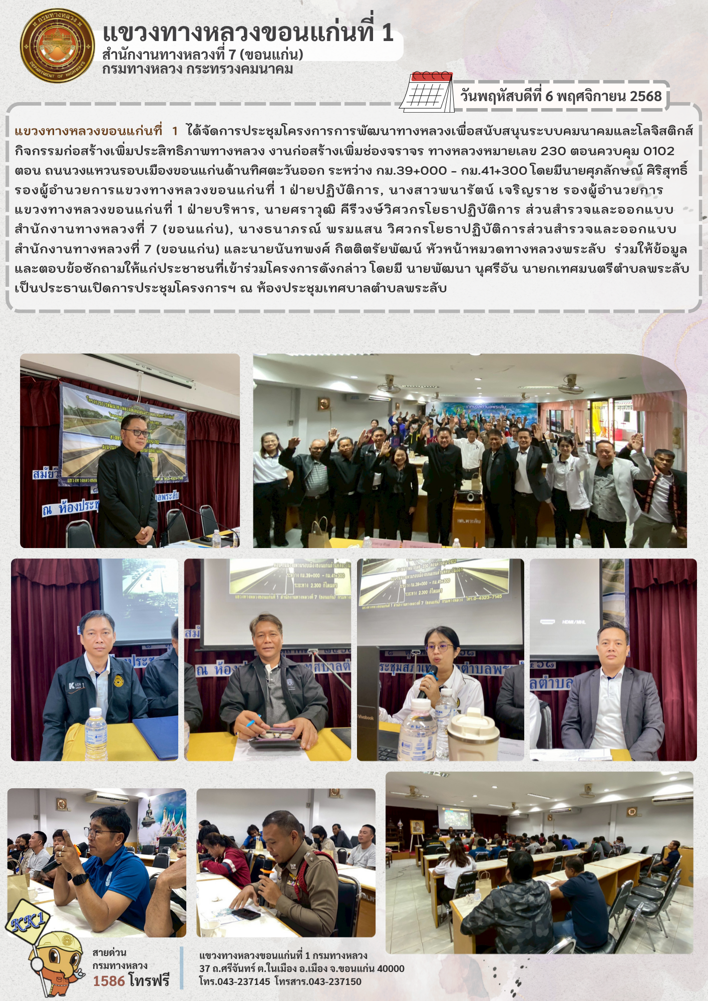 แขวงทางหลวงขอนแก่นที่ 1 ได้จัดการประชุมโครงการการพัฒนาทางหลวงเพื่อสนับสนุนระบบคมนาคมและโลจิสติกส์ กิจกรรมก่อสร้างเพิ่มประสิทธิภาพทางหลวง งานก่อสร้างเพิ่มช่องจราจร ทางหลวงหมายเลข 230 ตอนควบคุม 0102 ตอน ถนนวงแหวนรอบเมืองขอนแก่นด้านทิศตะวันออก ระหว่าง กม.39+000 - กม.41+300 โดยมีนายศุภลักษณ์ ศิริสุทธิ์ รองผู้อำนวยการแขวงทางหลวงขอนแก่นที่ 1 ฝ่ายปฏิบัติการ, นางสาวพนารัตน์ เจริญราช รองผู้อำนวยการแขวงทางหลวงขอนแก่นที่ 1 ฝ่ายบริหาร, นายศราวุฒิ คีรีวงษ์วิศวกรโยธาปฏิบัติการ ส่วนสำรวจและออกแบบ สำนักงานทางหลวงที่ 7 (ขอนแก่น), นางธนาภรณ์ พรมแสน วิศวกรโยธาปฏิบัติการส่วนสำรวจและออกแบบ สำนักงานทางหลวงที่ 7 (ขอนแก่น) และนายนันทพงศ์ กิตติตรัยพัฒน์ หัวหน้าหมวดทางหลวงพระลับ ร่วมให้ข้อมูลและตอบข้อซักถามให้แก่ประชาชนที่เข้าร่วมโครงการดังกล่าว โดยมี นายพัฒนา นุศรีอัน นายกเทศมนตรีตำบลพระลับ เป็นประธานเปิดการประชุมโครงการฯ ณ ห้องประชุมเทศบาลตำบลพระลับ