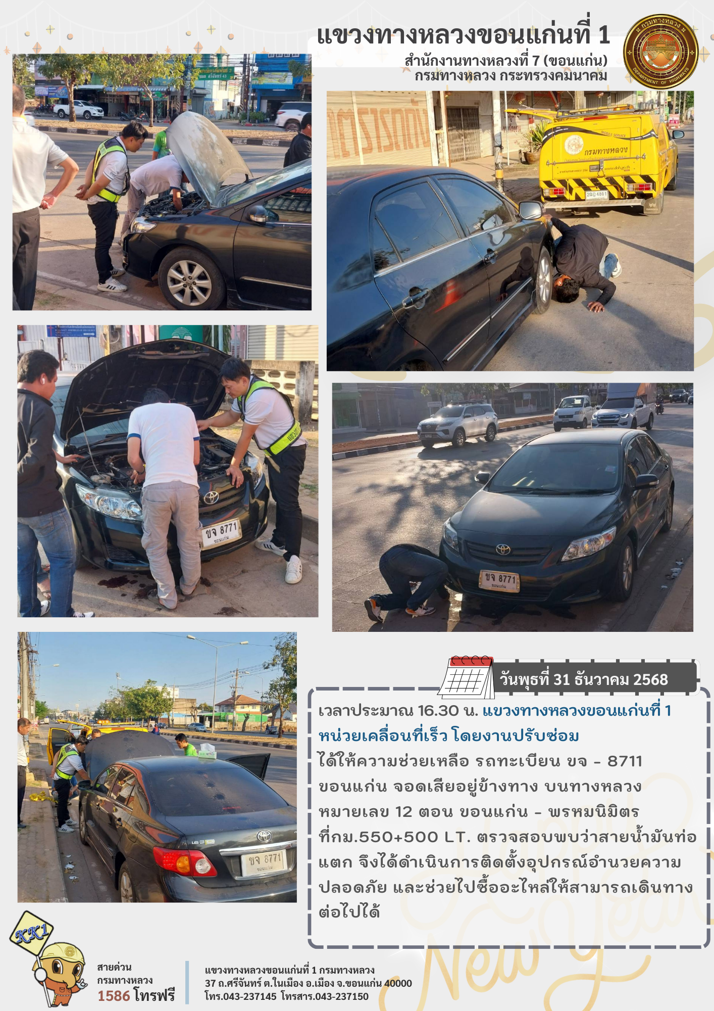 วันพุธที่ 31 ธันวาคม 2568 เวลาประมาณ 16.30 น. แขวงทางหลวงขอนแก่นที่ 1 หน่วยเคลื่อนที่เร็ว โดยงานปรับซ่อม ได้ให้ความช่วยเหลือ รถทะเบียน ขจ - 8711 ขอนแก่น จอดเสียอยู่ข้างทาง บนทางหลวงหมายเลข 12 ตอน ขอนแก่น - พรหมนิมิตร ที่กม.550+500 LT. ตรวจสอบพบว่าสายน้ำมันท่อแตก จึงได้ดำเนินการติดตั้งอุปกรณ์อำนวยความปลอดภัย และช่วยไปซื้ออะไหล่ให้สามารถเดินทางต่อไปได้