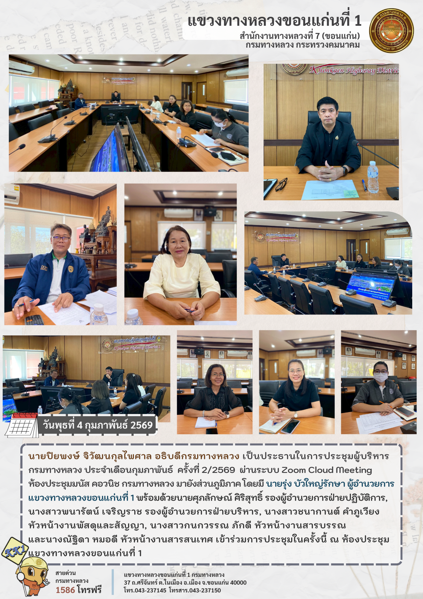 นายปิยพงษ์ จิวัฒนกุลไพศาล อธิบดีกรมทางหลวง เป็นประธานในการประชุมผู้บริหารกรมทางหลวง ประจำเดือนกุมภาพันธ์ ครั้งที่ 2/2569 ผ่านระบบ Zoom Cloud Meeting ห้องประชุมมนัส คอวนิช กรมทางหลวง มายังส่วนภูมิภาค โดยมี นายรุ่ง บัวใหญ่รักษา ผู้อำนวยการแขวงทางหลวงขอนแก่นที่ 1 พร้อมด้วยนายศุภลักษณ์ ศิริสุทธิ์ รองผู้อำนวยการฝ่ายปฏิบัติการ, นางสาวพนารัตน์ เจริญราช รองผู้อำนวยการฝ่ายบริหาร, นางสาวชนากานต์ คำภูเวียง หัวหน้างานพัสดุและสัญญา, นางสาวกนกวรรณ ภักดี หัวหน้างานสารบรรณ และนางณัฐิดา หมอดี หัวหน้างานสารสนเทศ เข้าร่วมการประชุมในครั้งนี้ ณ ห้องประชุมแขวงทางหลวงขอนแก่นที่ 1