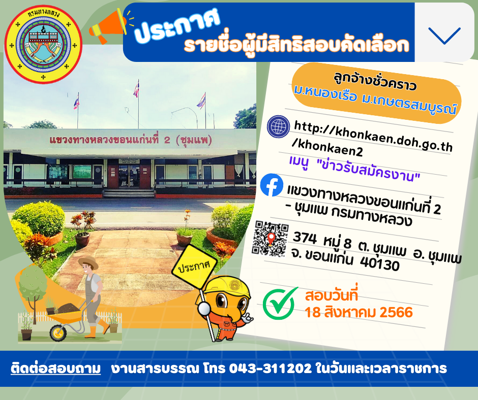 ประกาศรายชื่อผู้มีสิทธิสอบคัดเลือกลูกจ้างชั่วคราวรายวัน (คนงาน) ปฏิบัติงานหมวดทางหลวงหนองเรือ และหมวดทางหลวงเกษตรสมบูรณ์