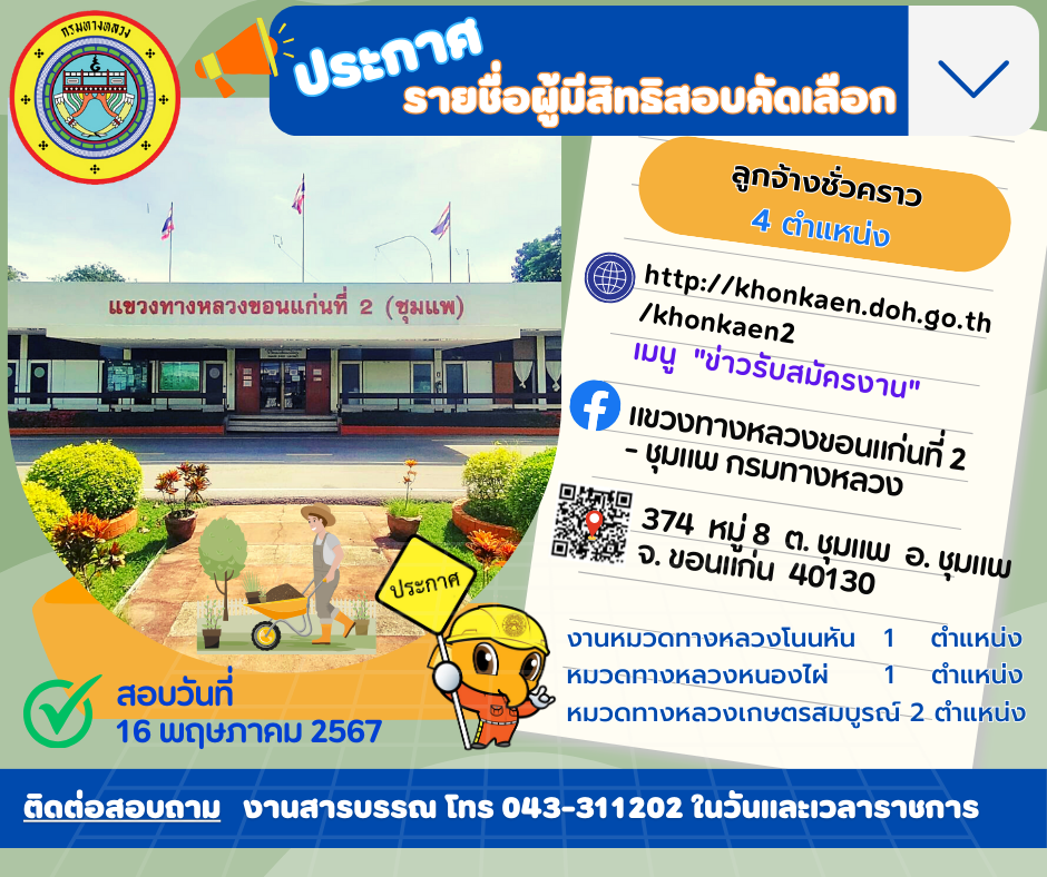 ตามประกาศ แขวงทางหลวงขอนแก่นที่ 2 (ชุมแพ) ลงวันที่ 1 พฤษภาคม พ.ศ.2567 ได้ประกาศรับสมัครลูกจ้างชั่วคราวรายวัน (คนงาน) เพื่อปฏิบัติงาน หมวดทางหลวงโนนหัน หมวดทางหลวงหนองไผ่ หมวดเกษตรสมบูรณ์ แขวงทางหลวงขอนแก่นที่ 2 (ชุมแพ) โดยเริ่มรับสมัครตั้งแต่ วันที่ 1 พฤษภาคม พ.ศ.2567 ถึงวันที่ 10 พฤษภาคม พ.ศ.2567