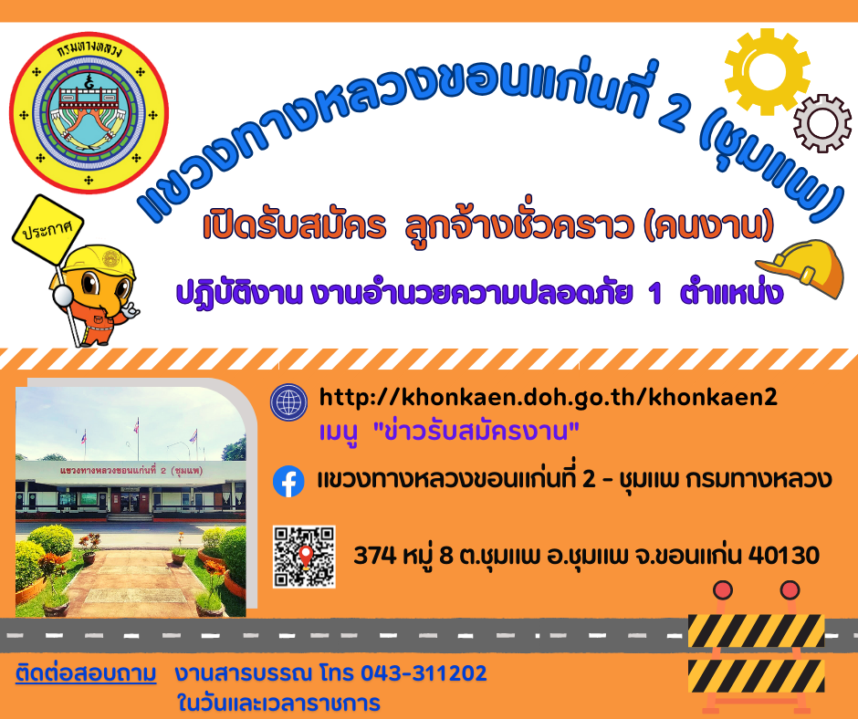 ด้วยแขวงทางหลวงขอนแก่นที่ ๒ (ชุมแพ) สังกัดสำนักงานทางหลวงที่ ๗ มีความประสงค์จะดำเนินการรับสมัครสอบคัดเลือกบุคคลเพื่อจ้างเป็นลูกจ้างชั่วคราวรายวัน ตำแหน่งคนงาน