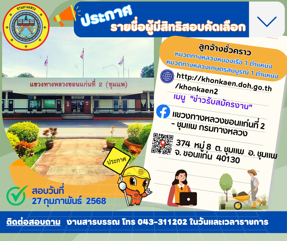 ตามประกาศ แขวงทางหลวงขอนแก่นที่ 2 (ชุมแพ) ลงวันที่ 19 กุมภาพันธ์ 2568 ได้ประกาศรับสมัครลูกจ้างชั่วคราวรายวัน (คนงาน) ปฏิบัติงาน หมวดทางหลวงหนองเรือ และหมวดทางหลวงเกษตรสมบูรณ์ แขวงทางหลวงขอนแก่นที่ 2 (ชุมแพ) โดยเริ่มรับสมัครตั้งแต่ วันที่ 19 กุมภาพันธ์ พ.ศ.2568 ถึงวันที่ 25 กุมภาพันธ์ พ.ศ.2568