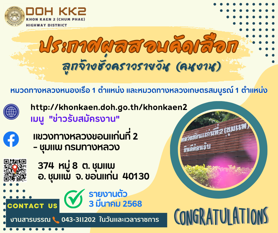 ตามที่แขวงทางหลวงขอนแก่นที่ ๒ (ชุมแพ) ได้ดำเนินการรับสมัครคัดเลือกลูกจ้างชั่วคราวรายวัน ปฏิบัติงาน แขวงทางหลวงขอนแก่นที่ ๒ (ชุมแพ) จำนวน 2 อัตรา ตั้งแต่วันที่ 19 กุมภาพันธ์ 2568 ถึงวันที่ 25 กุมภาพันธ์ 2568 ตามประกาศ ลงวันที่ 19 กุมภาพันธ์ 2568 นั้น