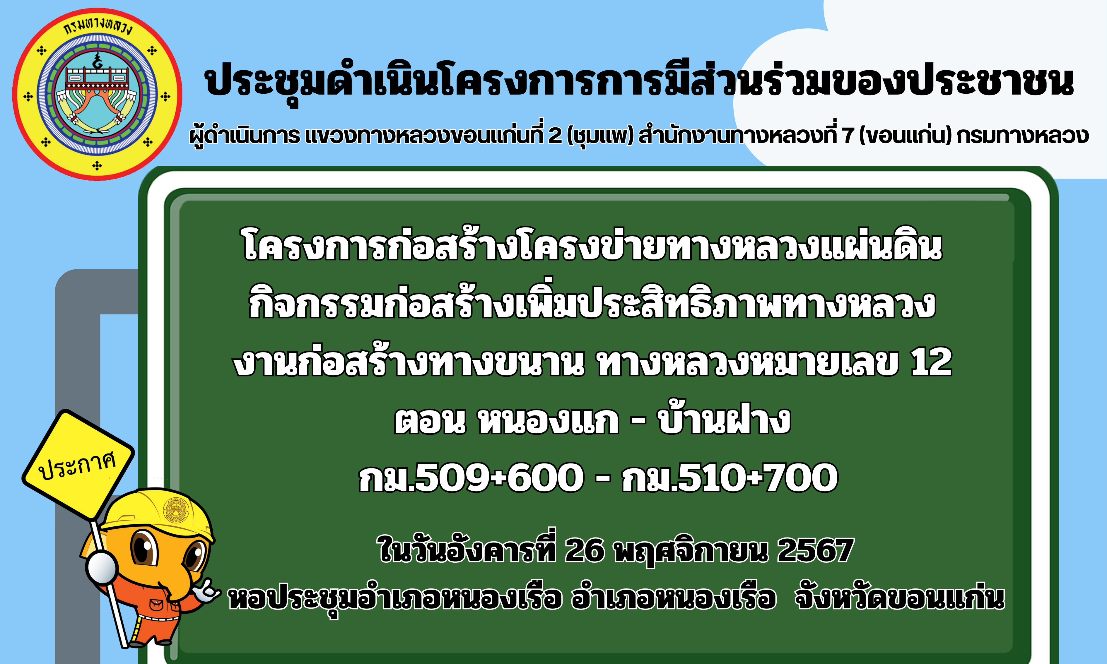 โครงการก่อสร้างโครงข่ายทางหลวงแผ่นดิน กิจกรรมก่อสร้างเพิ่มประสิทธิภาพทางหลวง งานก่อสร้างทางขนาน ทล. 12 ตอน หนองแก - บ้านฝาง กม.509+600 - กม.510+700 |