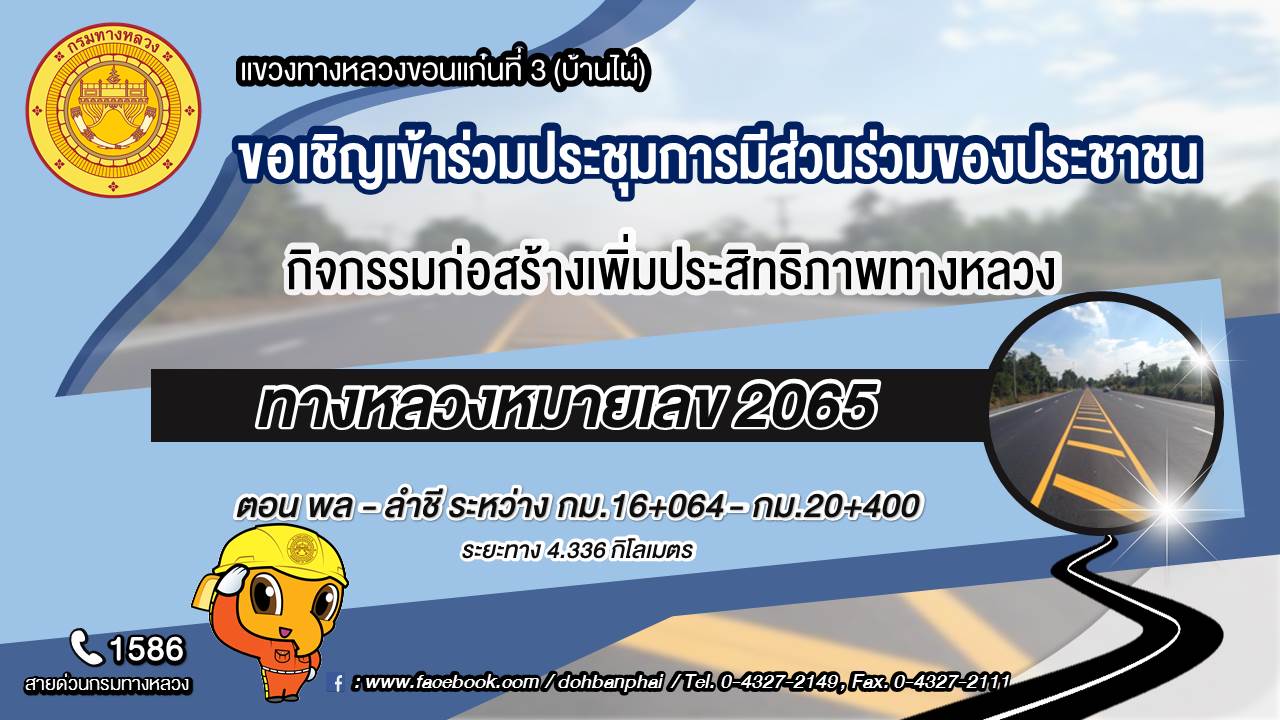 ด้วยแขวงทางหลวงขอนแก่นที่ 3 (บ้านไผ่) กรมทางหลวง ได้รับการจัดสรรงบประมาณปี 2565 เพื่อเพิ่มประสิทธิภาพในการรองรับปริมาณการจราจรที่เพิ่มมากขึ้น และอำนวยความสะดวกปลอดภัยแก่ผู้ใช้ทาง เพื่อให้ประชาชนในพื้นที่และประชาชนทั่วไปได้รับทราบข้อมูล เหตุผลความจำเป็น วัตถุประสงค์สาระสำคัญ สถานที่ ขั้นตอนและระยะเวลาดำเนินการ ผลผลิตและผลลัพธ์ของโครงการ และรายละเอียดอื่น ๆ เพื่อสร้างความรู้ความเข้าใจที่ถูกต้อง และเปิดโอกาสให้ทุกภาคส่วนที่เกี่ยวข้อง ได้เข้ามามีส่วนร่วมในการแสดงความคิดเห็น และข้อเสนอแนะที่เป็นประโยชน์ แขวงทางหลวงขอนแก่นที่ 3 (บ้านไผ่) กรมทางหลวง จึงขอเรียนเชิญผู้ที่สนใจเข้าร่วมประชุมการมีส่วนร่วมของประชาชน รายละเอียด ดังนี้