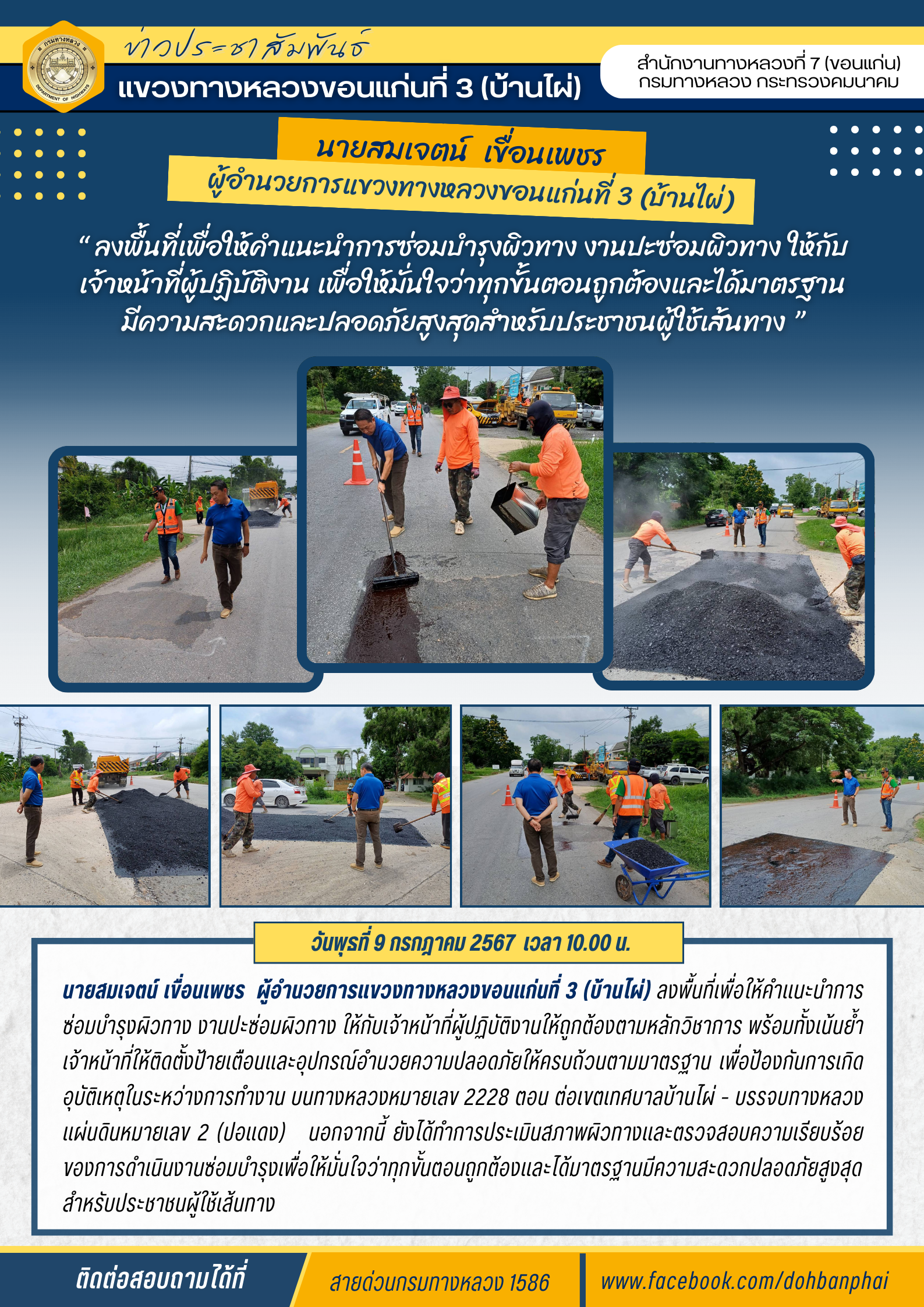 #นายสมเจตน์ เขื่อนเพชร  ผู้อำนวยการแขวงทางหลวงขอนแก่นที่ 3 (บ้านไผ่) ลงพื้นที่เพื่อให้คำแนะนำการซ่อมบำรุงผิวทาง งานปะซ่อมผิวทาง ให้กับเจ้าหน้าที่ผู้ปฏิบัติงานให้ถูกต้องตามหลักวิชาการ พร้อมทั้งเน้นย้ำเจ้าหน้าที่ให้ติดตั้งป้ายเตือนและอุปกรณ์อำนวยความปลอดภัยให้ครบถ้วนตามมาตรฐาน เพื่อป้องกันการเกิดอุบัติเหตุในระหว่างการทำงาน บนทางหลวงหมายเลข 2228 ตอน ต่อเขตเทศบาลบ้านไผ่ - บรรจบทางหลวงแผ่นดินหมายเลข 2 (ปอแดง)   นอกจากนี้ ยังได้ทำการประเมินสภาพผิวทางและตรวจสอบความเรียบร้อยของการดำเนินงานซ่อมบำรุงเพื่อให้มั่นใจว่าทุกขั้นตอนถูกต้องและได้มาตรฐานมีความสะดวกปลอดภัยสูงสุดสำหรับประชาชนผู้ใช้เส้นทาง