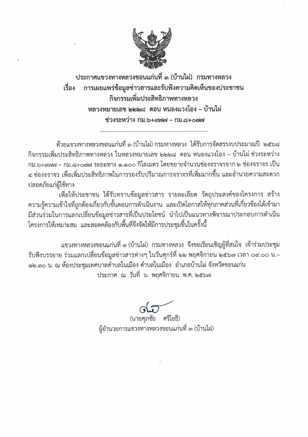 ประกาศแขวงทางหลวงขอนแก่นที่ 3 (บ้านไผ่) กรมทางหลวง