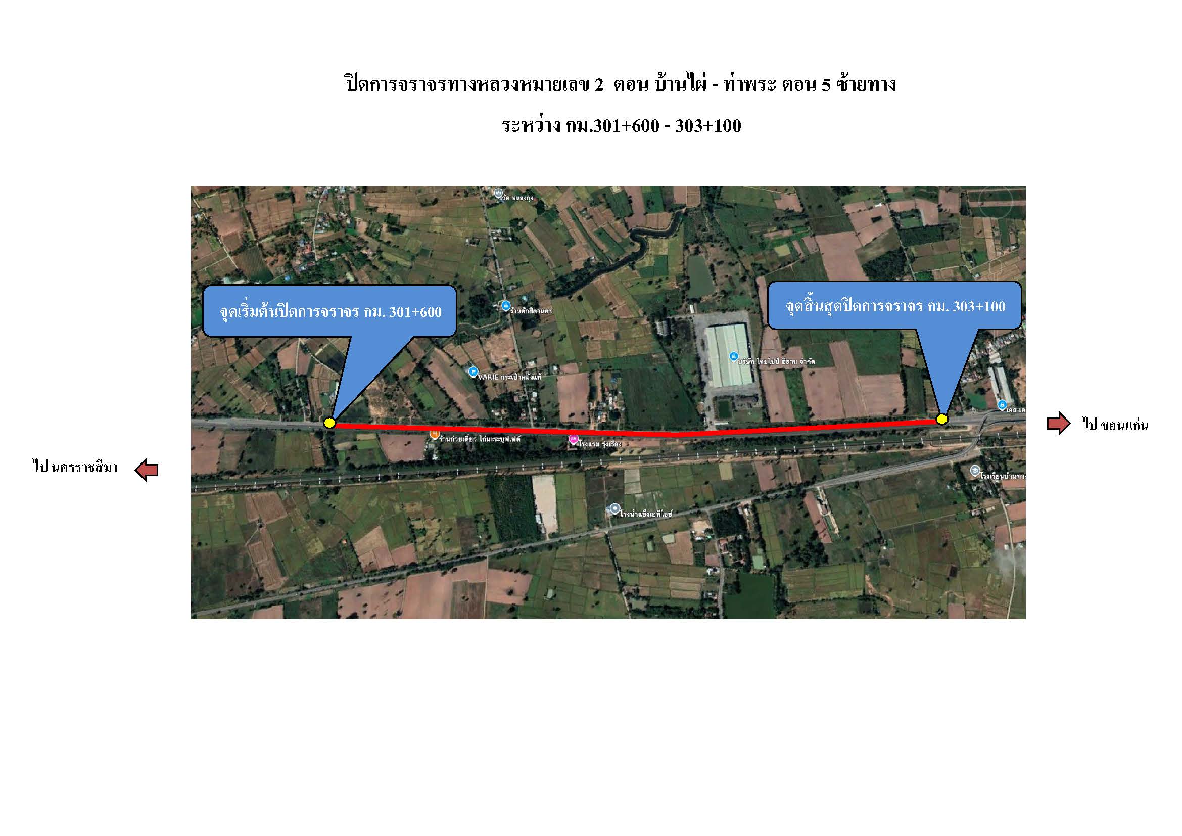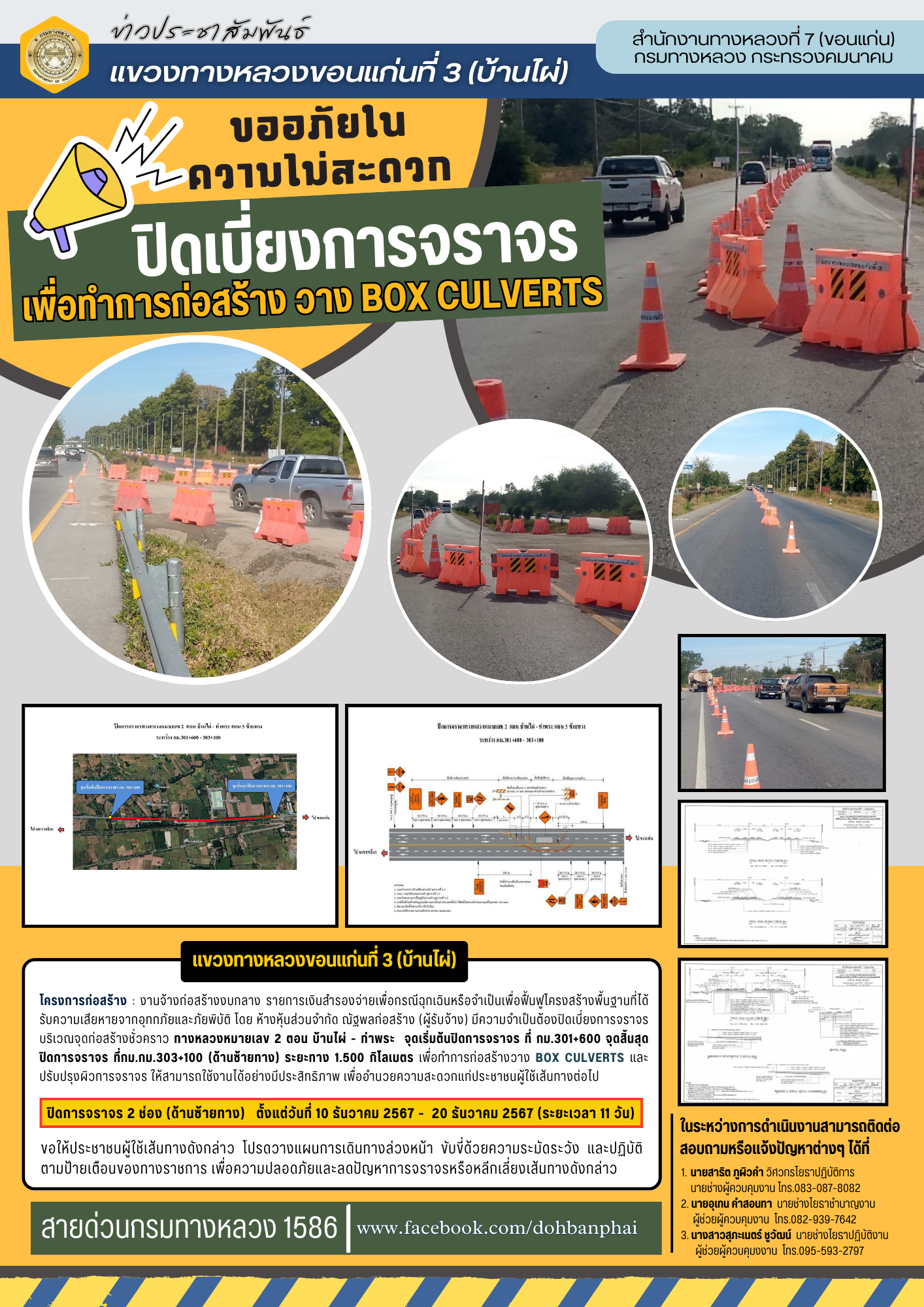 #แขวงทางหลวงขอนแก่นที่ 3 (บ้านไผ่) โครงการก่อสร้าง : งานจ้างก่อสร้างงบกลาง รายการเงินสำรองจ่ายเพื่อกรณีฉุกเฉินหรือจำเป็นเพื่อฟื้นฟูโครงสร้างพื้นฐานที่ได้รับความเสียหายจากอุทกภัยและภัยพิบัติ โดย ห้างหุ้นส่วนจำกัด ณัฐพลก่อสร้าง (ผู้รับจ้าง) มีความจำเป็นต้องปิดเบี่ยงการจราจรบริเวณจุดก่อสร้างชั่วคราว บนทางหลวงหมายเลข 2 ตอน บ้านไผ่ - ท่าพระ เริ่มที่ กม.309+700 สิ้นสุดที่ กม.311+000 (ด้านซ้ายทาง) ระยะทาง 1.300 กิโลเมตร เพื่อทำการก่อสร้าง วาง BOX CULVERTS และปรับปรุงผิวการจราจร ให้สามารถใช้งานได้อย่างมีประสิทธิภาพ เพื่ออำนวยความสะดวกแก่ประชาชนผู้ใช้เส้นทางต่อไป โดยปิดช่องจราจร 2 ช่อง (ด้านซ้ายทาง) ตั้งแต่วันที่ 10 ธันวาคม 2567 - วันที่ 20 ธันวาคม 2567 (ระยะเวลา 11 วัน) ขอให้ประชาชนผู้ใช้เส้นทางดังกล่าว โปรดวางแผนการเดินทางล่วงหน้า ขับขี่ด้วยความระมัดระวัง และปฏิบัติตามป้ายเตือนของทางราชการเพื่อความปลอดภัยและลดปัญหาการจราจรหรือหลีกเลี่ยงเส้นทางดังกล่าว