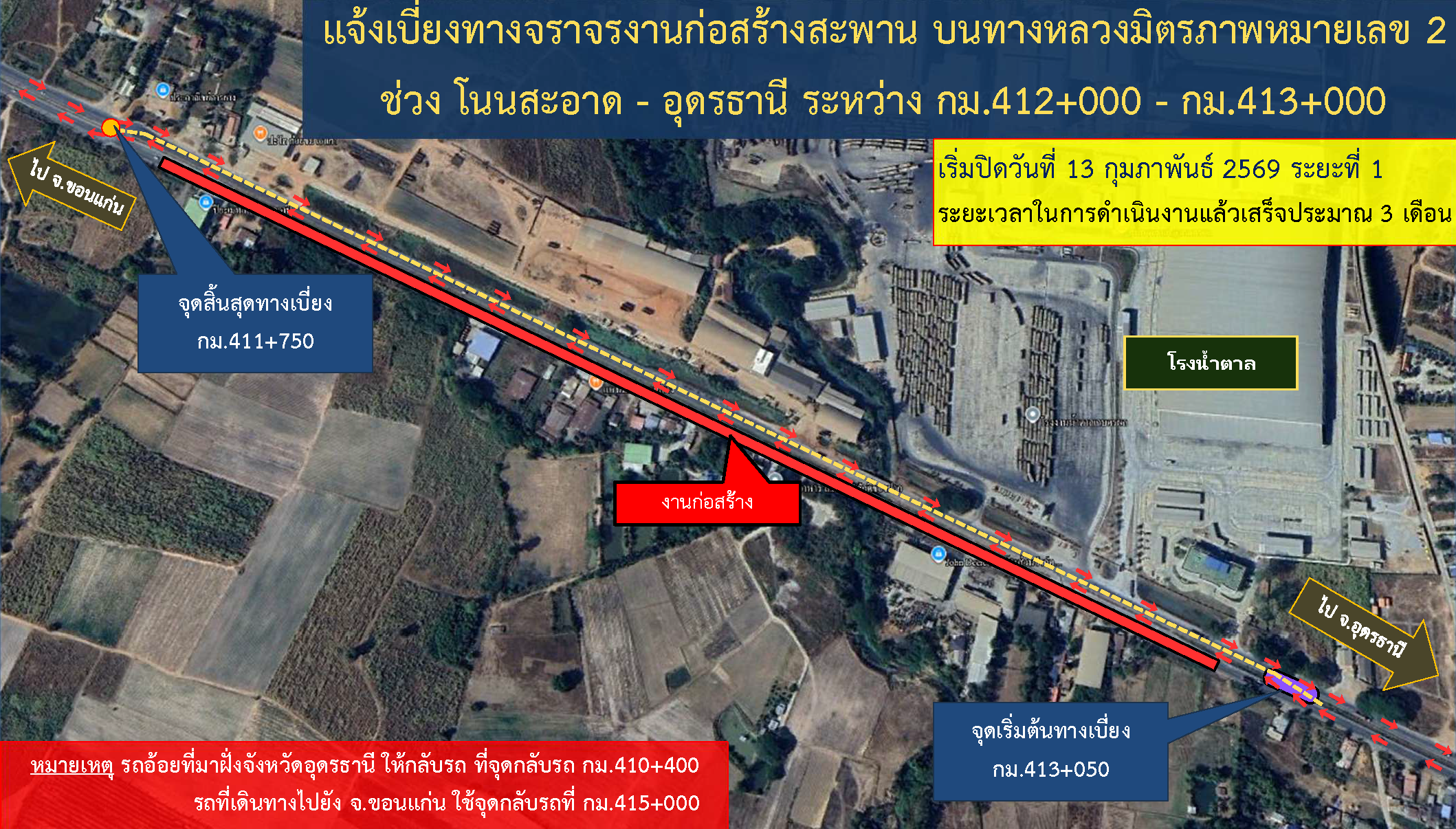 เบี่ยงการจราจร งานฟื้นฟูทางหลวง ทางหลวงหมายเลข 2 ตอน โนนสะอาด - อุดรธานี ระหว่าง กม.411+850 (LT.,RT.) - กม.413+000 (LT.,RT.)