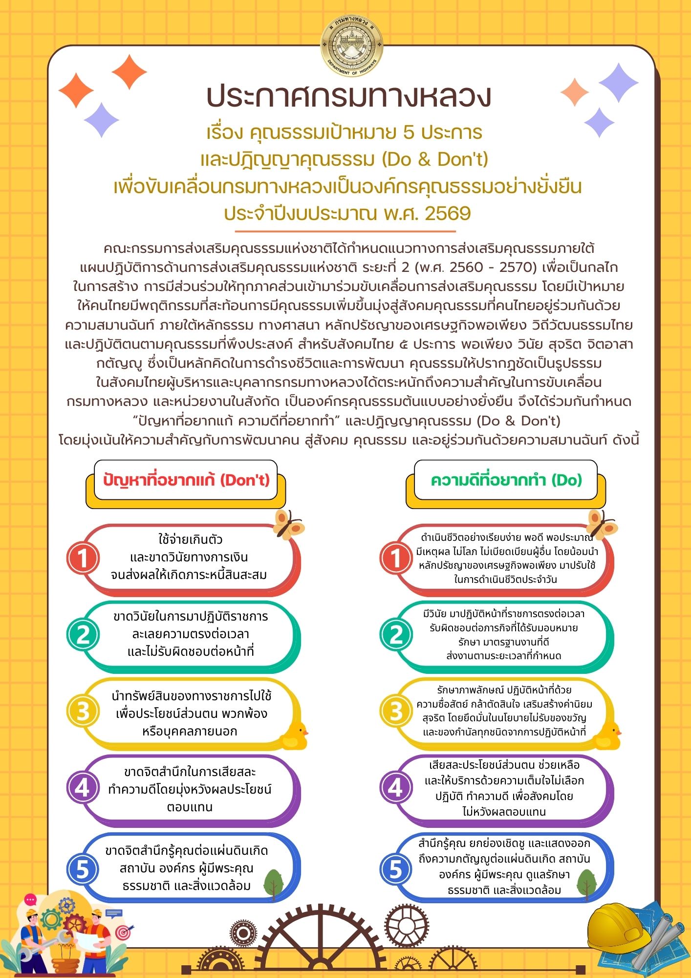 เรื่อง คุณธรรมเป้าหมาย 5 ประการ และปฏิญญาคุณธรรม (Do & Don't) เพื่อขับเคลื่อนกรมทางหลวงเป็นองค์กรคุณธรรมอย่างยั่งยืน ประจําปีงบประมาณ พ.ศ. 2569