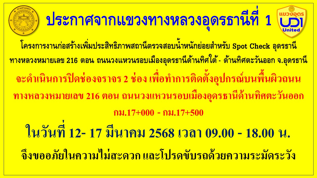 จะดำเนินการปิดช่องจราจร 2 ช่อง เพื่อทำการติดตั้งอุปกรณ์บนพื้นผิวถนน ทางหลวงหมายเลข 216 ตอน ถนนวงแหวนรอบเมืองอุดรธานีด้านทิศตะวันออก กม.17+000 - กม.17+500