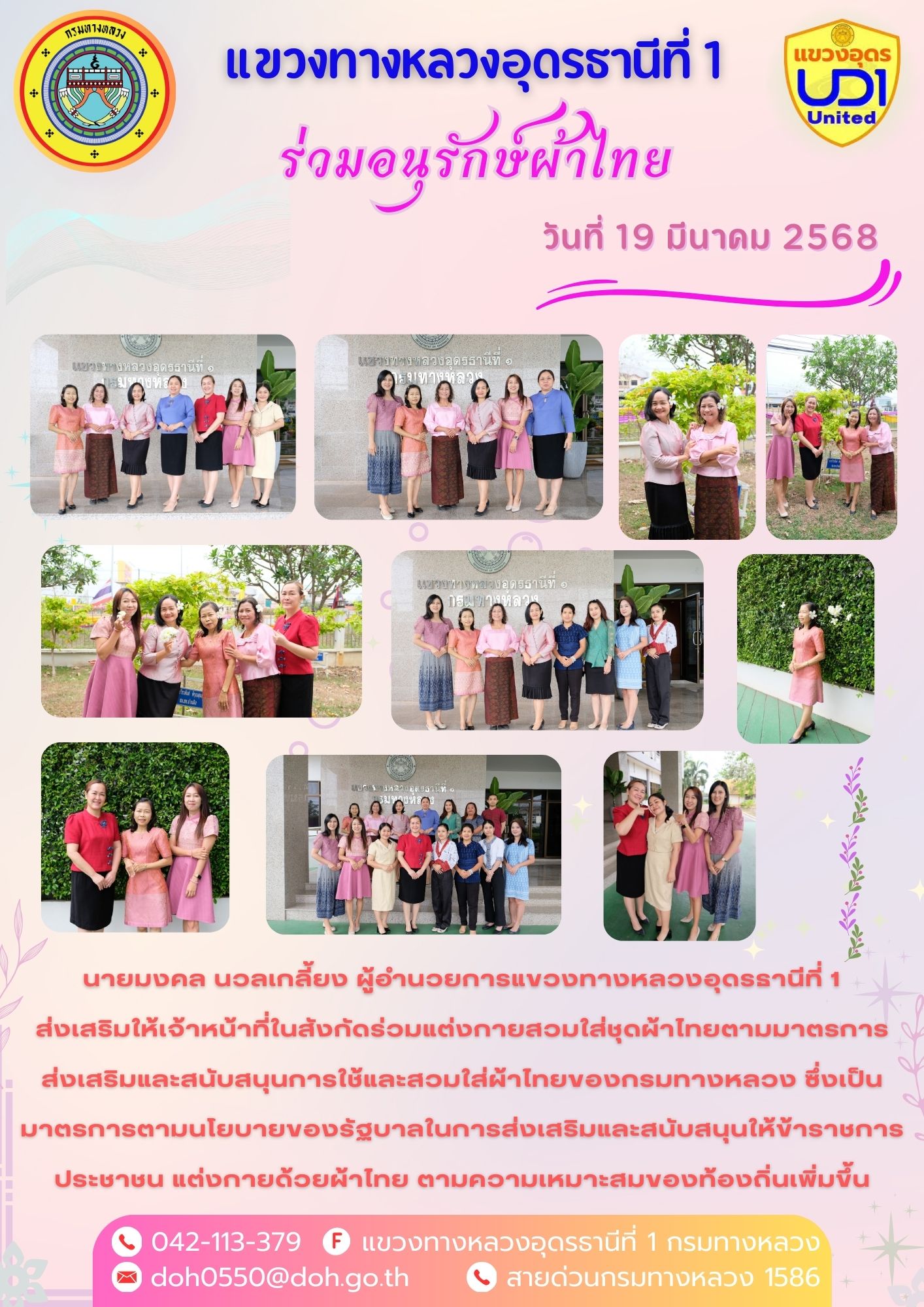นายมงคล นวลเกลี้ยง ผู้อำนวยการแขวงทางหลวงอุดรธานีที่ 1 ส่งเสริมให้เจ้าหน้าที่ในสังกัดร่วมแต่งกายสวมใส่ชุดผ้าไทยตามมาตรการ ส่งเสริมและสนับสนุนการใช้และสวมใส่ผ้าไทยของกรมทางหลวง ซึ่งเป็นมาตรการตามนโยบายของรัฐบาลในการส่งเสริมและสนับสนุนให้ข้าราชการ ประชาชน แต่งกายด้วยผ้าไทย ตามความเหมาะสมของท้องถิ่นเพิ่มขึ้น