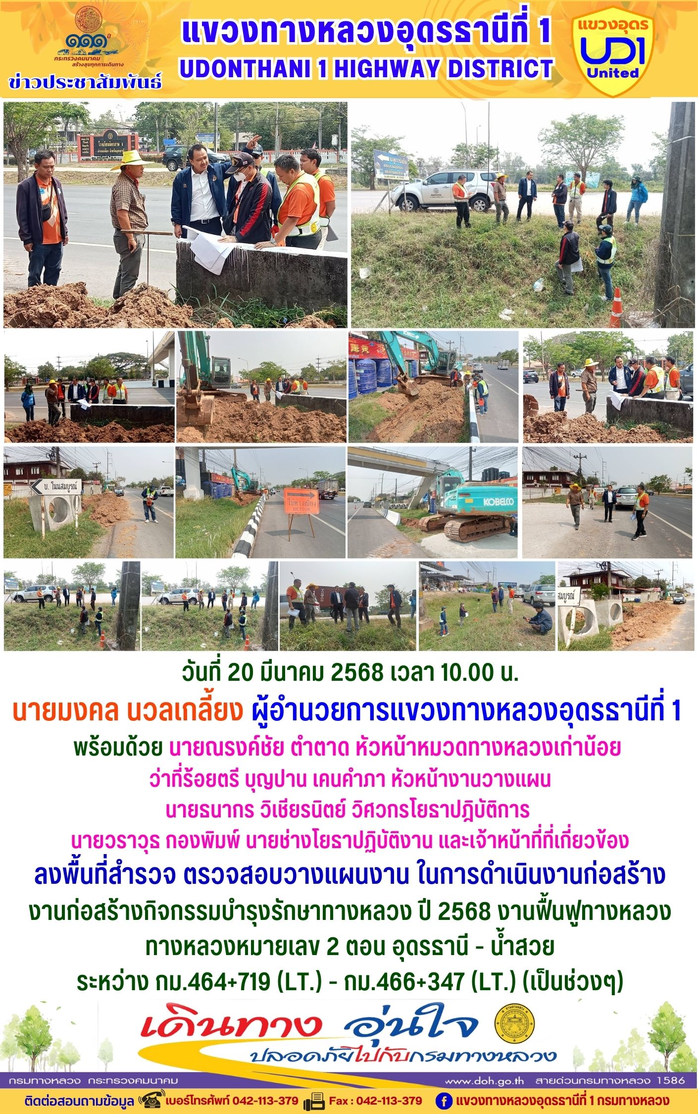 ลงพื้นที่สำรวจ ตรวจสอบวางแผนงาน ในการดำเนินงานก่อสร้าง งานก่อสร้างกิจกรรมบำรุงรักษาทางหลวง ปี 2568 งานฟื้นฟูทางหลวง ทางหลวงหมายเลข 2 ตอน อุดรธานี - น้ำสวย ระหว่าง กม.464+719 (LT.) - กม.466+347 (LT.) (เป็นช่วงๆ)