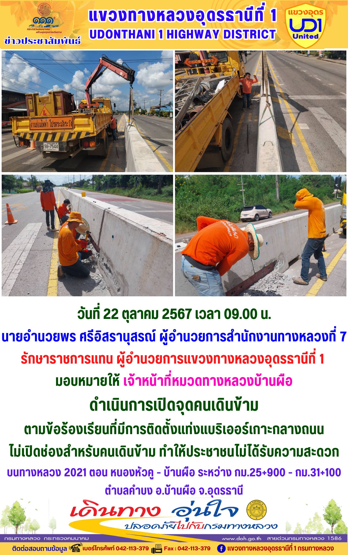 ดำเนินการเปิดจุดคนเดินข้าม ตามข้อร้องเรียน บนทางหลวง 2021 ตอน หนองหัวคู - บ้านผือ ระหว่าง กม.25+900 - กม.31+100