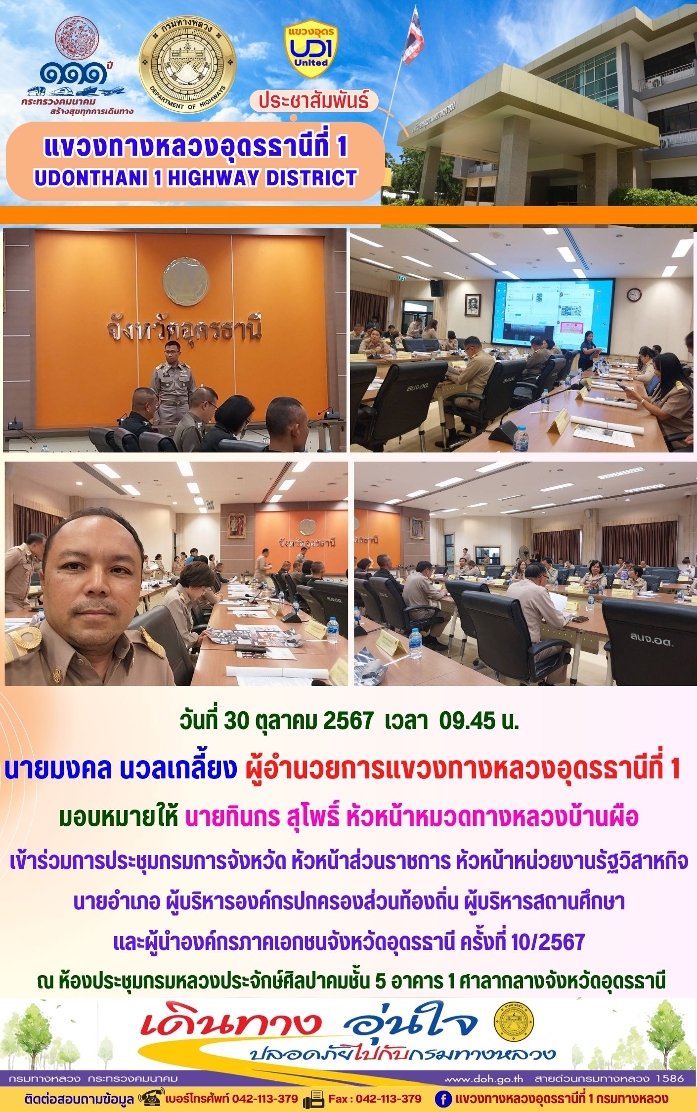การประชุมกรมการจังหวัด หัวหน้าส่วนราชการ หัวหน้าหน่วยงานรัฐวิสาหกิจ นายอำเภอ ผู้บริหารองค์กรปกครองส่วนท้องถิ่น ผู้บริหารสถานศึกษา และผู้นำองค์กรภาคเอกชนจังหวัดอุดรธานี ครั้งที่ 10/2567 ณ ห้องประชุมกรมหลวงประจักษ์ศิลปาคมชั้น 5 อาคาร 1 ศาลากลางจังหวัดอุดรธานี