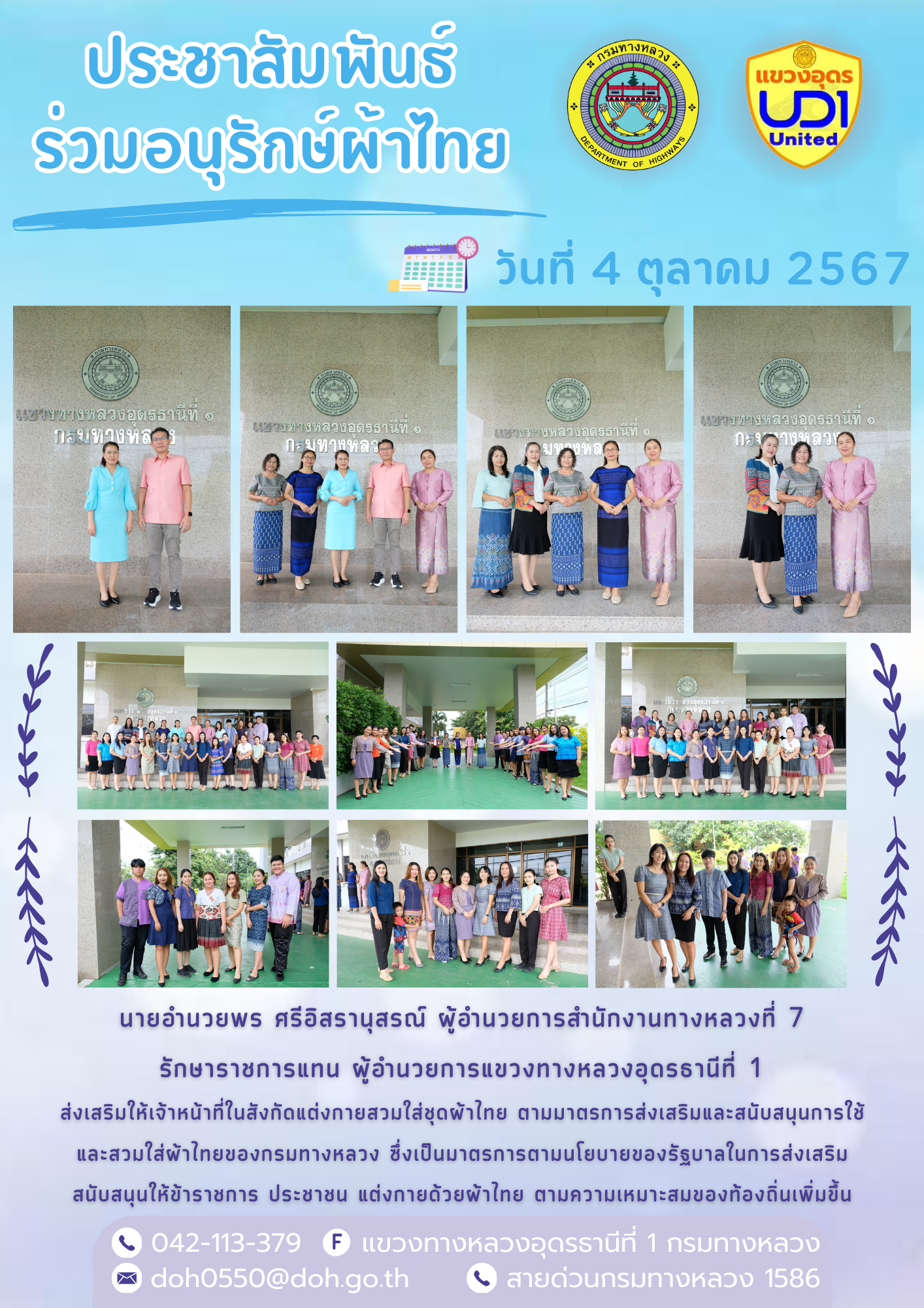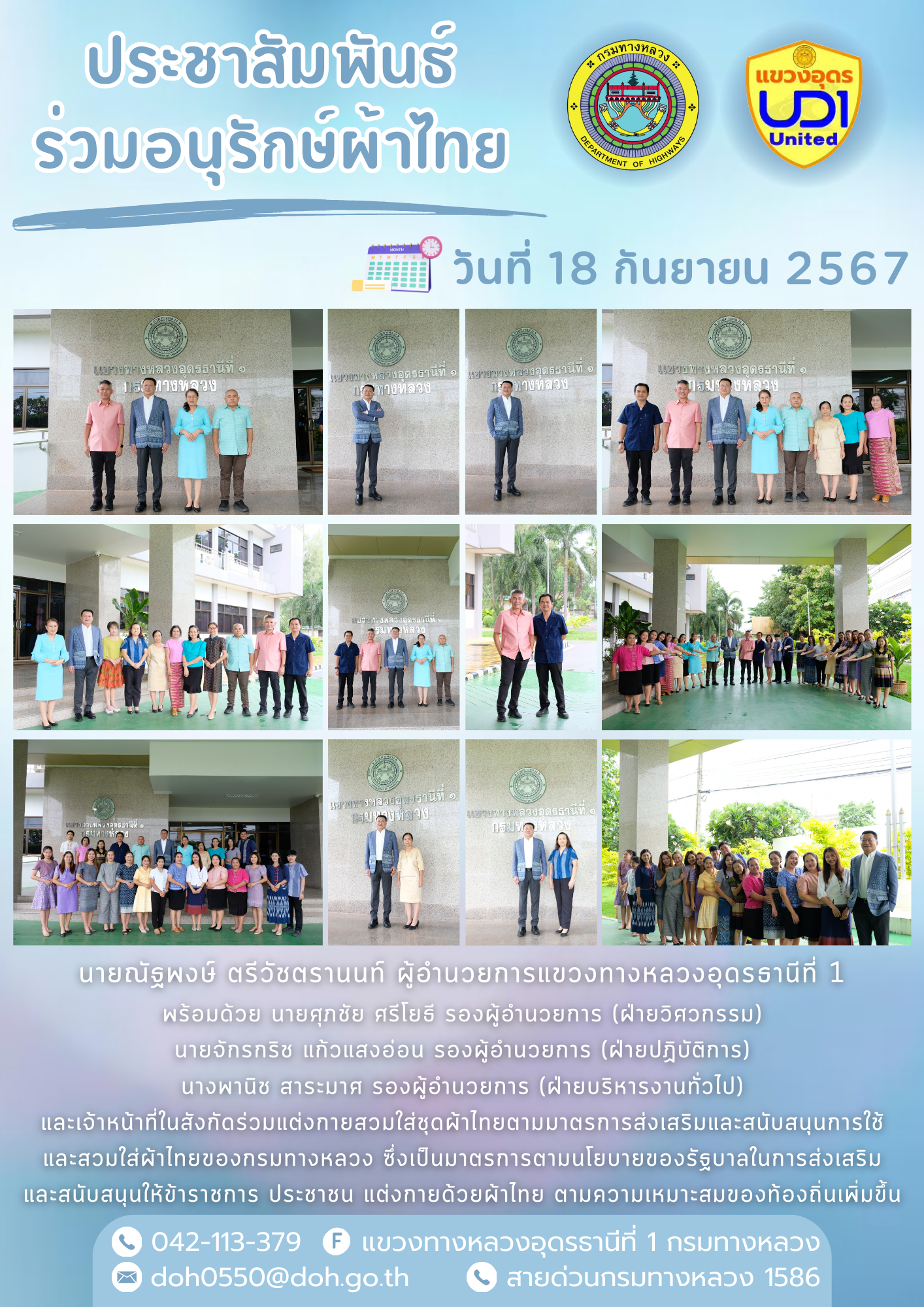 นายณัฐพงษ์ ตรีวัชตรานนท์ ผู้อำนวยการแขวงทางหลวงอุดรธานีที่ 1 พร้อมด้วย นายจักรกริช แก้วแสงอ่อน รองผู้อำนวยการ (ฝ่ายปฏิบัติการ) นางพานิช สาระมาศ รองผู้อำนวยการ (ฝ่ายบริหารงานทั่วไป) และเจ้าหน้าที่ในสังกัดร่วมแต่งกายสวมใส่ชุดผ้าไทยตามมาตรการส่งเสริมและสนับสนุนการใช้ และสวมใส่ผ้าไทยของกรมทางหลวง ซึ่งเป็นมาตรการตามนโยบายของรัฐบาลในการส่งเสริม และสนับสนุนให้ข้าราชการ ประชาชน แต่งกายด้วยผ้าไทย ตามความเหมาะสมของท้องถิ่นเพิ่มขึ้น