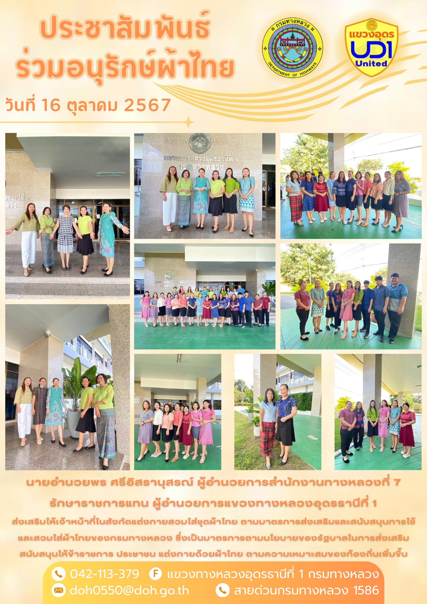 นายอำนวยพร ศรีอิสรานุสรณ์ ผู้อำนวยการสำนักงานทางหลวงที่ 7 รักษาราชการแทน ผู้อำนวยการแขวงทางหลวงอุดรธานีที่ 1 ส่งเสริมให้เจ้าหน้าที่ในสังกัดแต่งกายสวมใส่ชุดผ้าไทย ตามมาตรการส่งเสริมและสนับสนุนการใช้ และสวมใส่ผ้าไทยของกรมทางหลวง ซึ่งเป็นมาตรการตามนโยบายของรัฐบาลในการส่งเสริม สนับสนุนให้ข้าราชการ ประชาชน แต่งกายด้วยผ้าไทย ตามความเหมาะสมของท้องถิ่นเพิ่มขึ้น