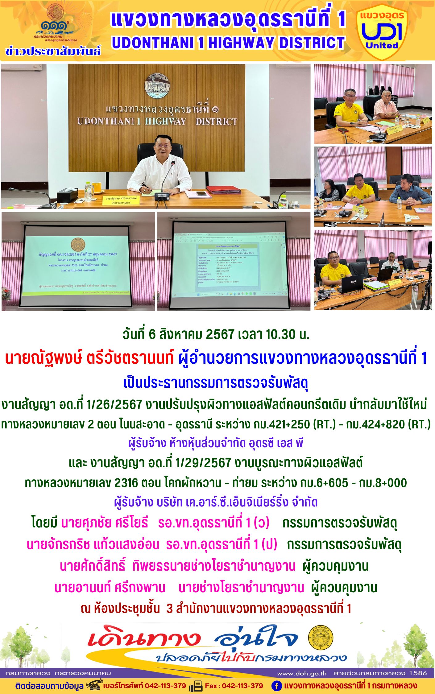 ลงพื้นที่ตรวจงานสัญญา อด.ที่ 1/26/2567 กิจกรรมบำรุงรักษาทางหลวง ปี 2567 งานปรับปรุงผิวทางแอสฟัลต์คอนกรีตเดิม นำกลับมาใช้ใหม่ ทางหลวงหมายเลข 2 ตอน โนนสะอาด - อุดรธานี ระหว่าง กม.421+250 (RT.) - กม.424+820 (RT.)