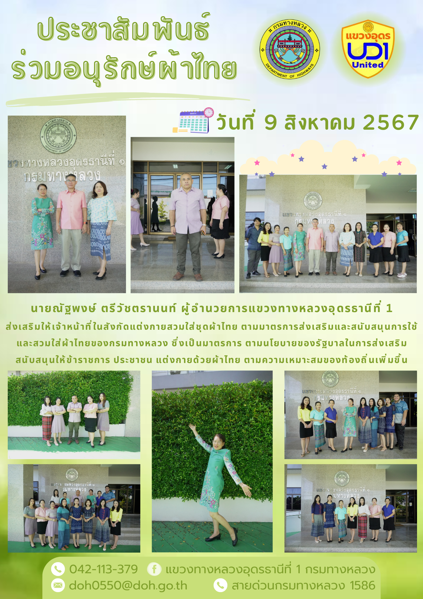 นายณัฐพงษ์ ตรีวัชตรานนท์ ผู้อำนวยการแขวงทางหลวงอุดรธานีที่ 1 ส่งเสริมให้เจ้าหน้าที่ในสังกัดแต่งกายสวมใส่ชุดผ้าไทย ตามมาตรการส่งเสริมและสนับสนุนการใช้และสวมใส่ผ้าไทยของกรมทางหลวง ซึ่งเป็นมาตรการ ตามนโยบายของรัฐบาลในการส่งเสริมสนับสนุนให้ข้าราชการ ประชาชน แต่งกายด้วยผ้าไทย ตามความเหมาะสมของท้องถิ่นเพิ่มขึ้น