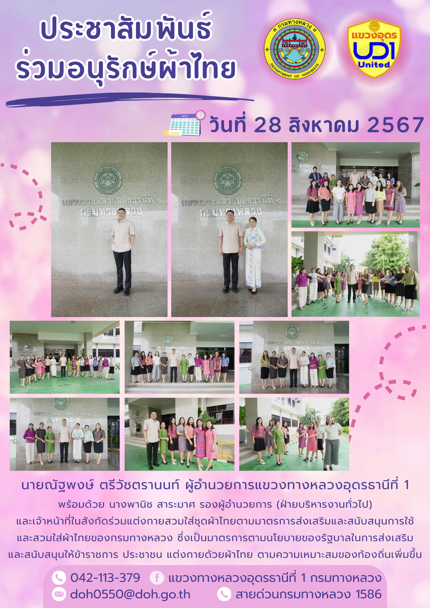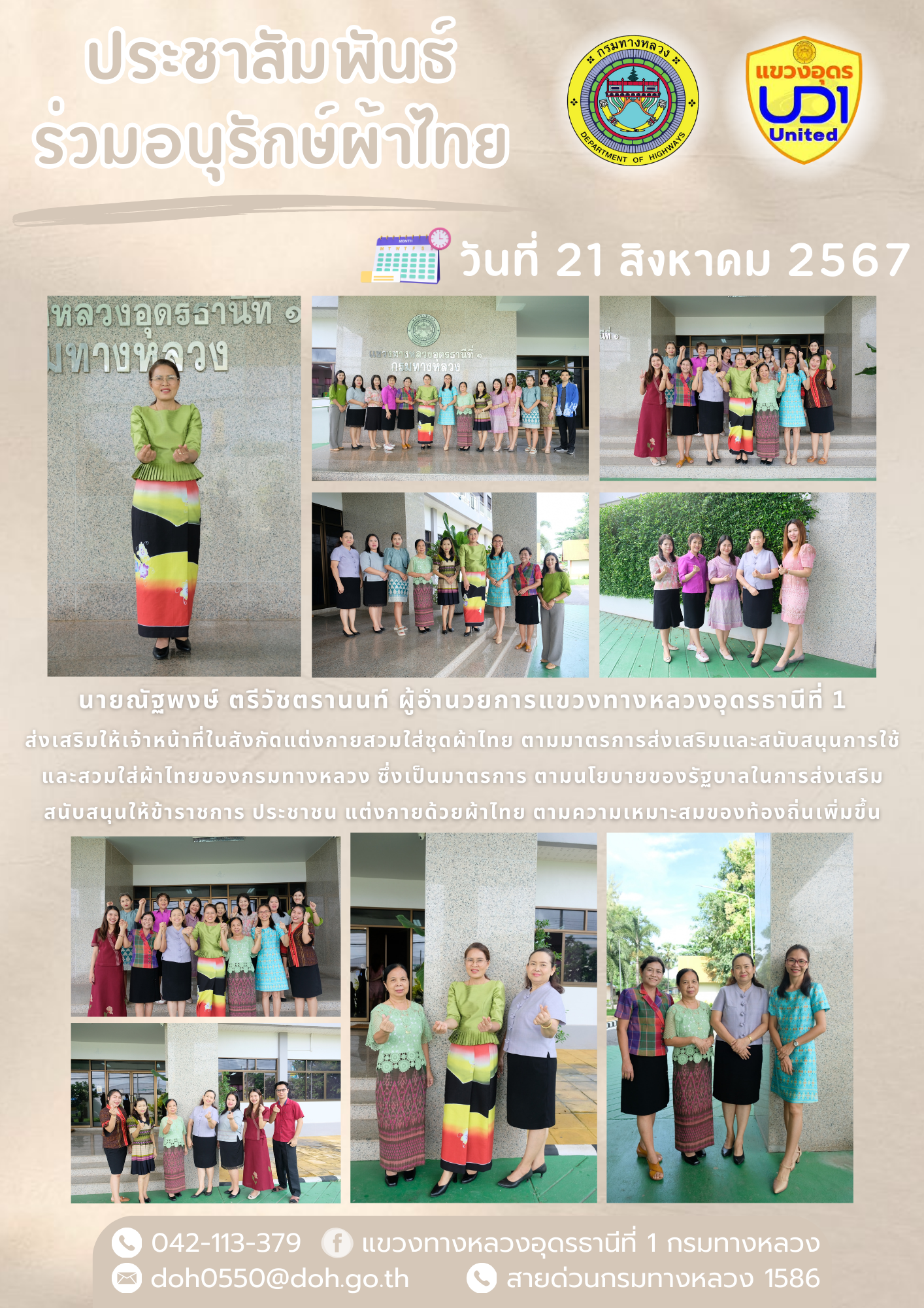นายณัฐพงษ์ ตรีวัชตรานนท์ ผู้อำนวยการแขวงทางหลวงอุดรธานีที่ 1 พร้อมด้วย นางพานิช สาระมาศ รองผู้อำนวยการ (ฝ่ายบริหารงานทั่วไป) และเจ้าหน้าที่ในสังกัดร่วมแต่งกายสวมใส่ชุดผ้าไทยตามมาตรการส่งเสริมและสนับสนุนการใช้ และสวมใส่ผ้าไทยของกรมทางหลวง ซึ่งเป็นมาตรการตามนโยบายของรัฐบาลในการส่งเสริม และสนับสนุนให้ข้าราชการ ประชาชน แต่งกายด้วยผ้าไทย ตามความเหมาะสมของท้องถิ่นเพิ่มขึ้น