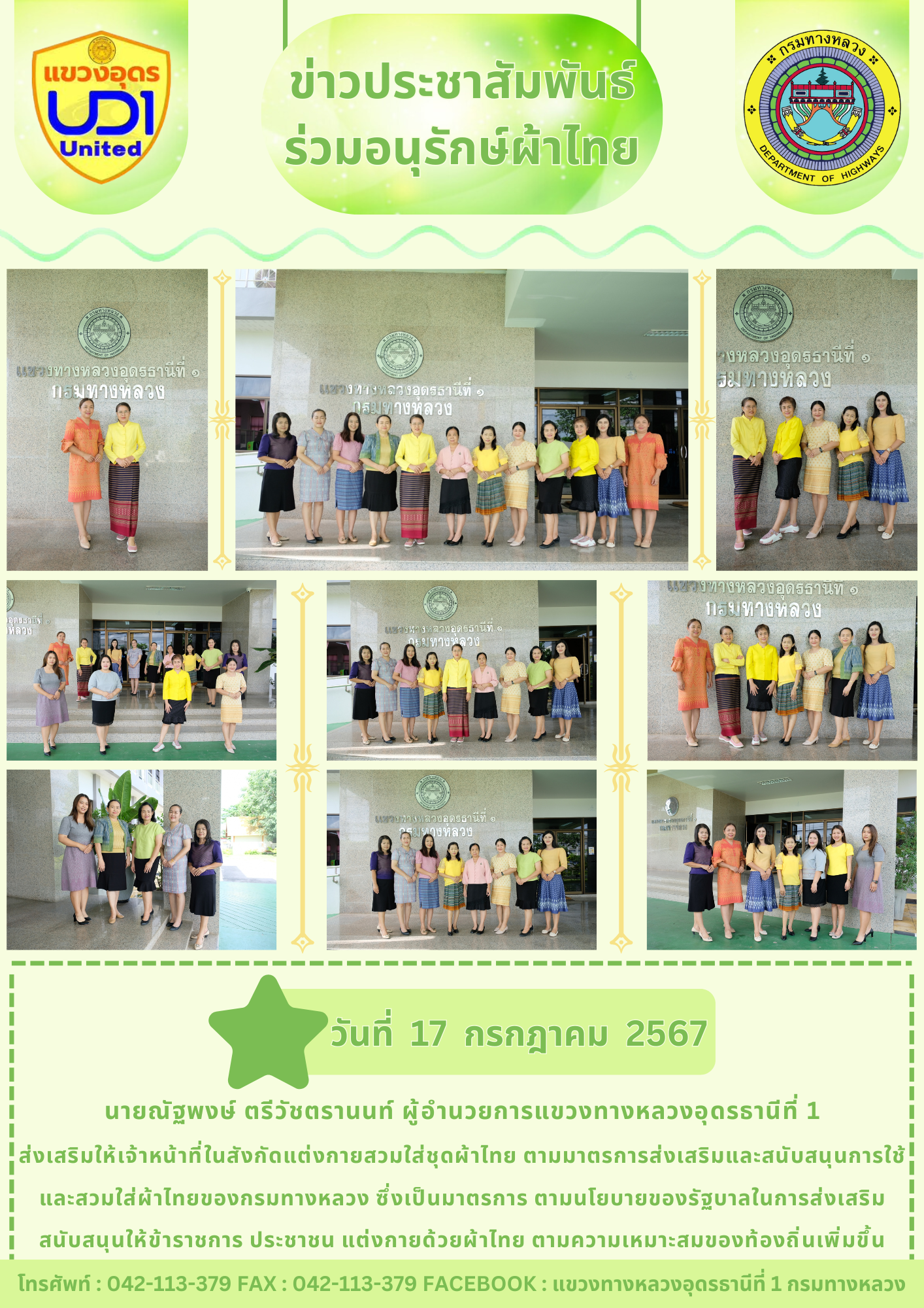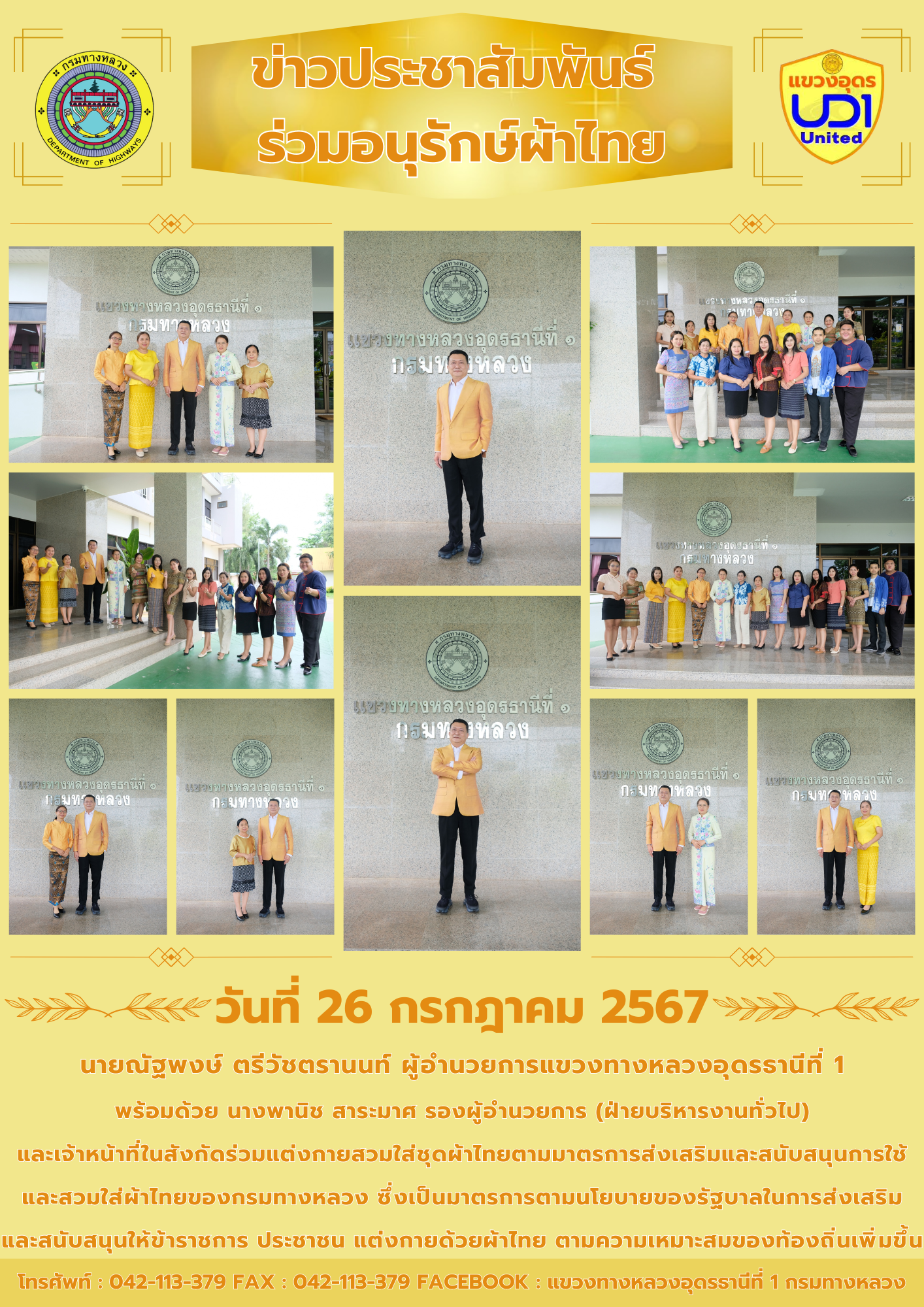 นายณัฐพงษ์ ตรีวัชตรานนท์ ผู้อำนวยการแขวงทางหลวงอุดรธานีที่ 1 พร้อมด้วย นางพานิช สาระมาศ รองผู้อำนวยการ (ฝ่ายบริหารงานทั่วไป) และเจ้าหน้าที่ในสังกัดร่วมแต่งกายสวมใส่ชุดผ้าไทยตามมาตรการส่งเสริมและสนับสนุนการใช้ และสวมใส่ผ้าไทยของกรมทางหลวง ซึ่งเป็นมาตรการตามนโยบายของรัฐบาลในการส่งเสริม และสนับสนุนให้ข้าราชการ ประชาชน แต่งกายด้วยผ้าไทย ตามความเหมาะสมของท้องถิ่นเพิ่มขึ้น